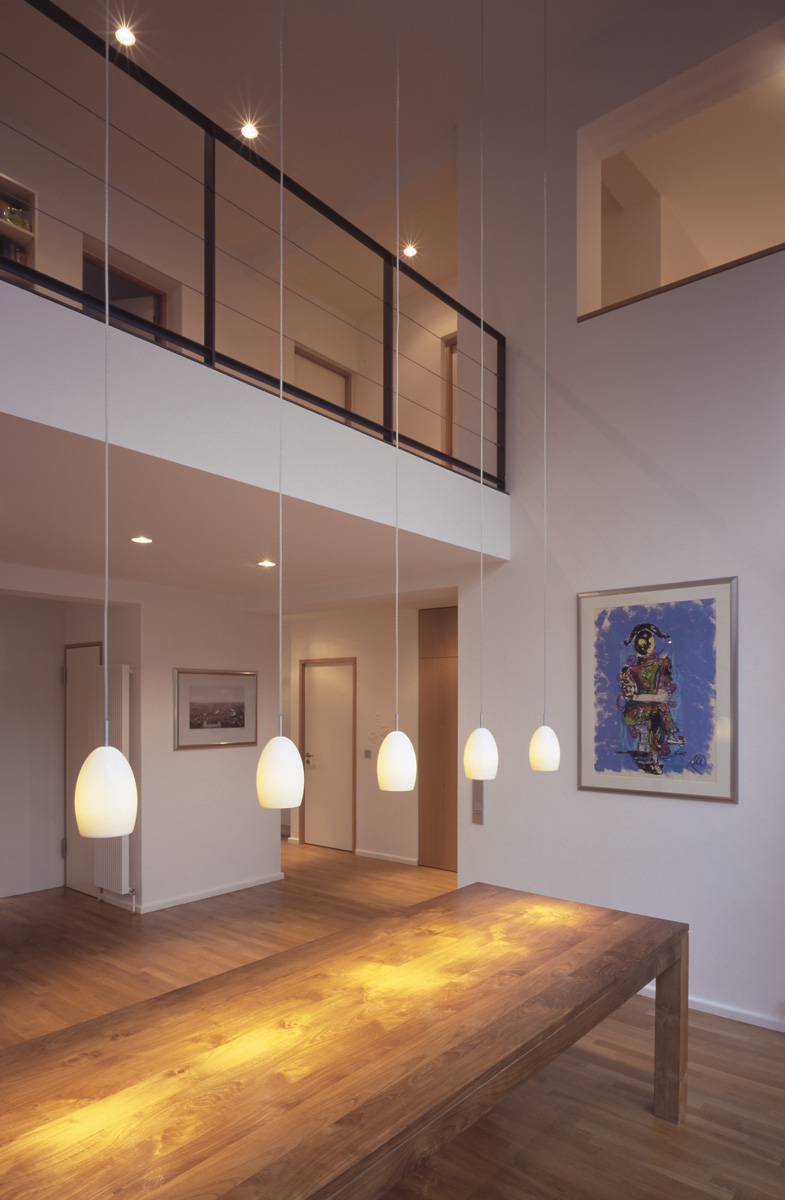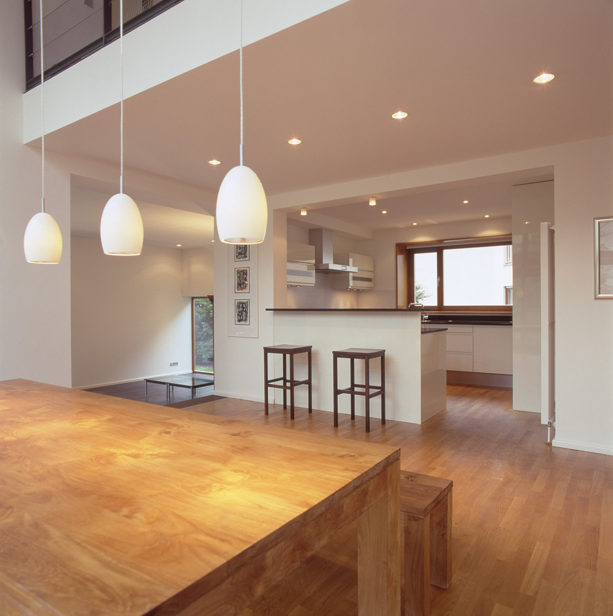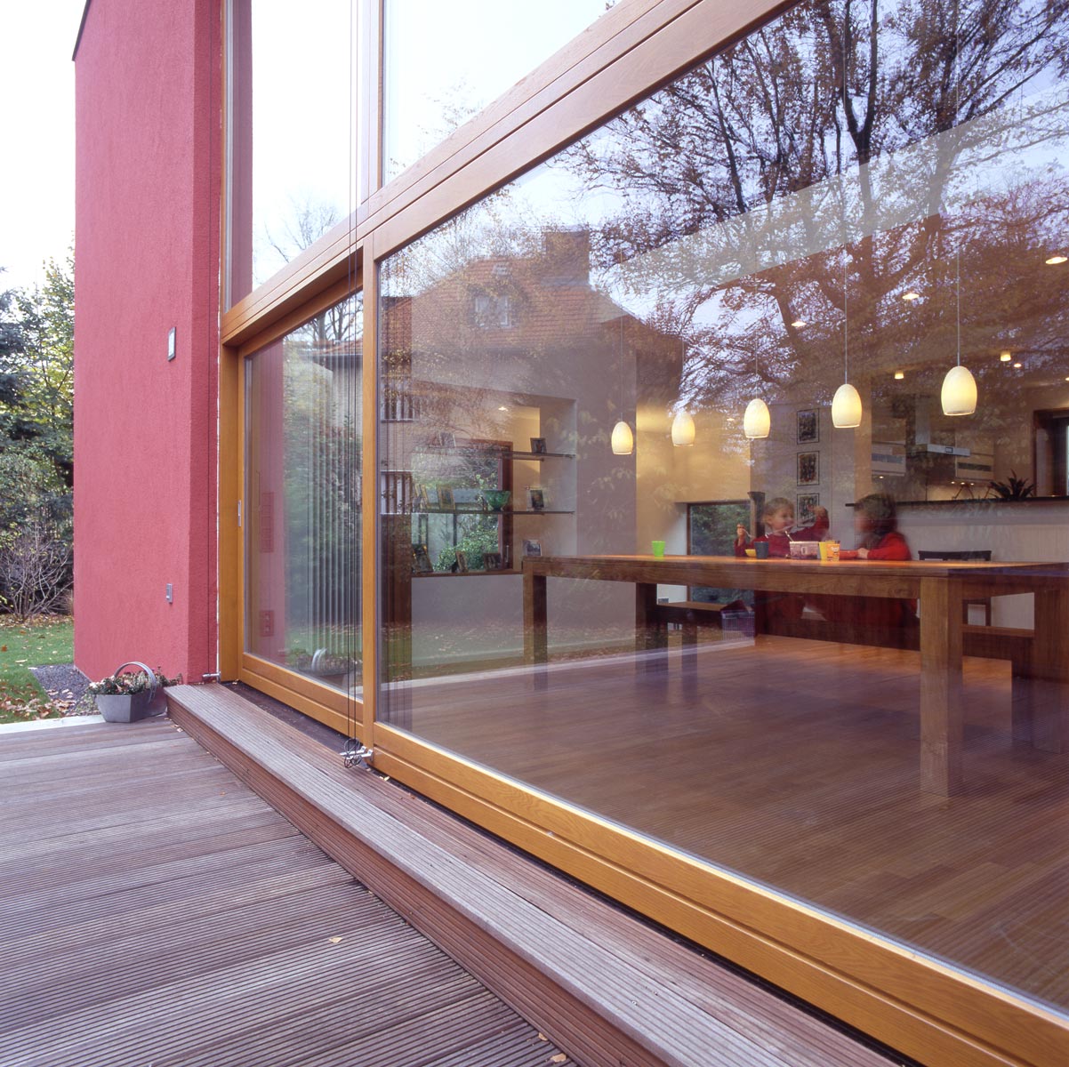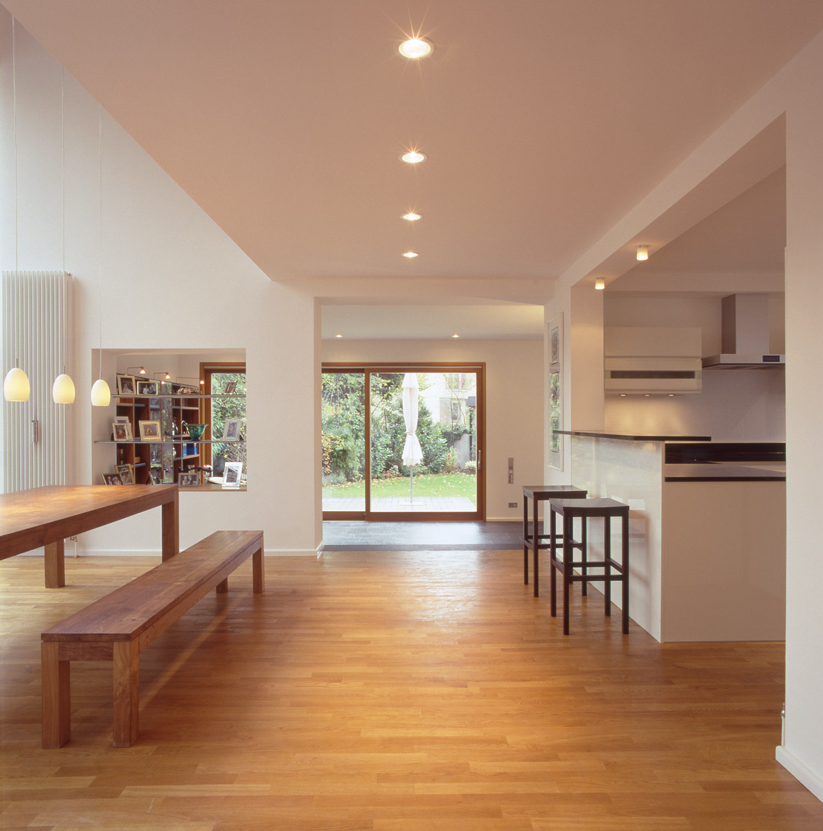 Obwohl das Gebäude verhältnismäßig viel Grundstücksfläche einnimmt, weist der Garten durch die unterschiedlichen Freibereiche (Patio, Terrasse, Vorplatz, Kinderspielbereich, Holzdeck) eine Vielfalt an Qualitäten auf. Im Haus selbst setzt sich die Ausbildung sehr unterschiedlicher Raumsituationen auf den verschiedenen Ebenen fort - aus dem einst hässlichen Entlein ist ein schöner Schwan geworden.