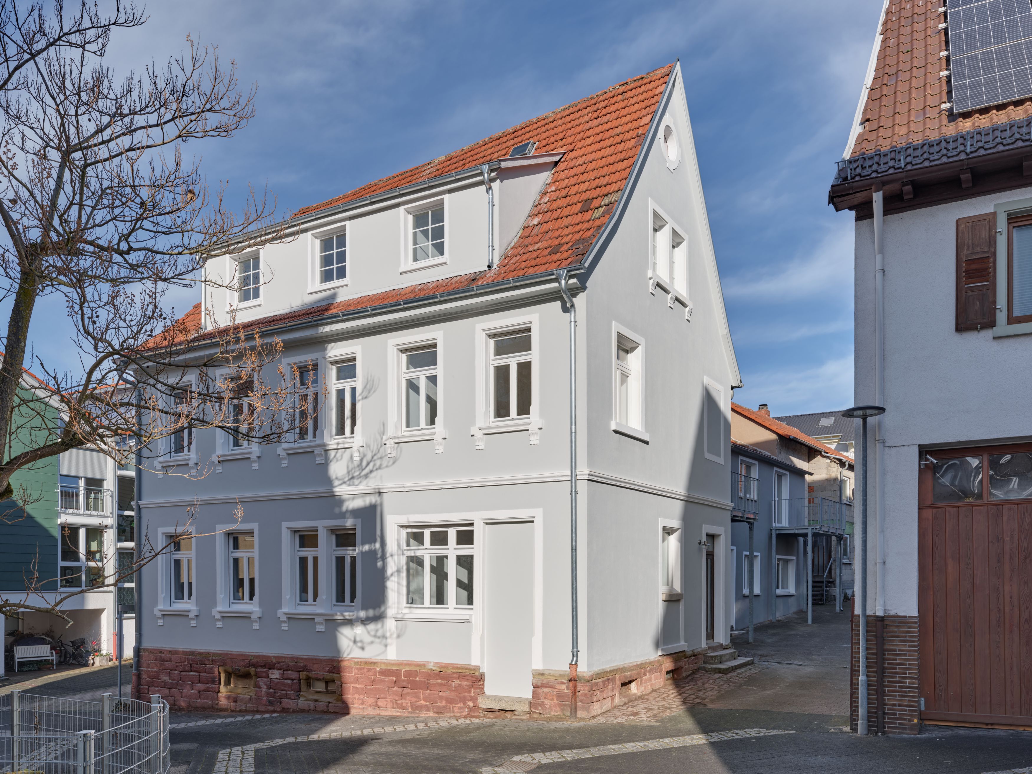 Ein ortsbildprägendes Ensemble aus Vorderhaus, ehem. Scheune und neuerem Hinterhaus zwischen Heidelberg und Walldorf stand zum Abbruch. Das über einhundert Jahre alte Vorderhaus beherbergt nun, nach fachgerechter Sanierung, vier helle Wohnungen, der Seitenbau wurde ebenfalls zu Wohnraum umgebaut. Das verwahrloste Zweifamilienhaus aus den sechziger Jahren im hinteren Teil des tiefen Grundstücks bietet nach der Sanierung weiteren drei Wohnungen Platz. Entstanden ist damit ein Beispiel für die erfolgreiche, maßvolle Nachverdichtung bestehender Bausubstanz im historischen Ortskern.