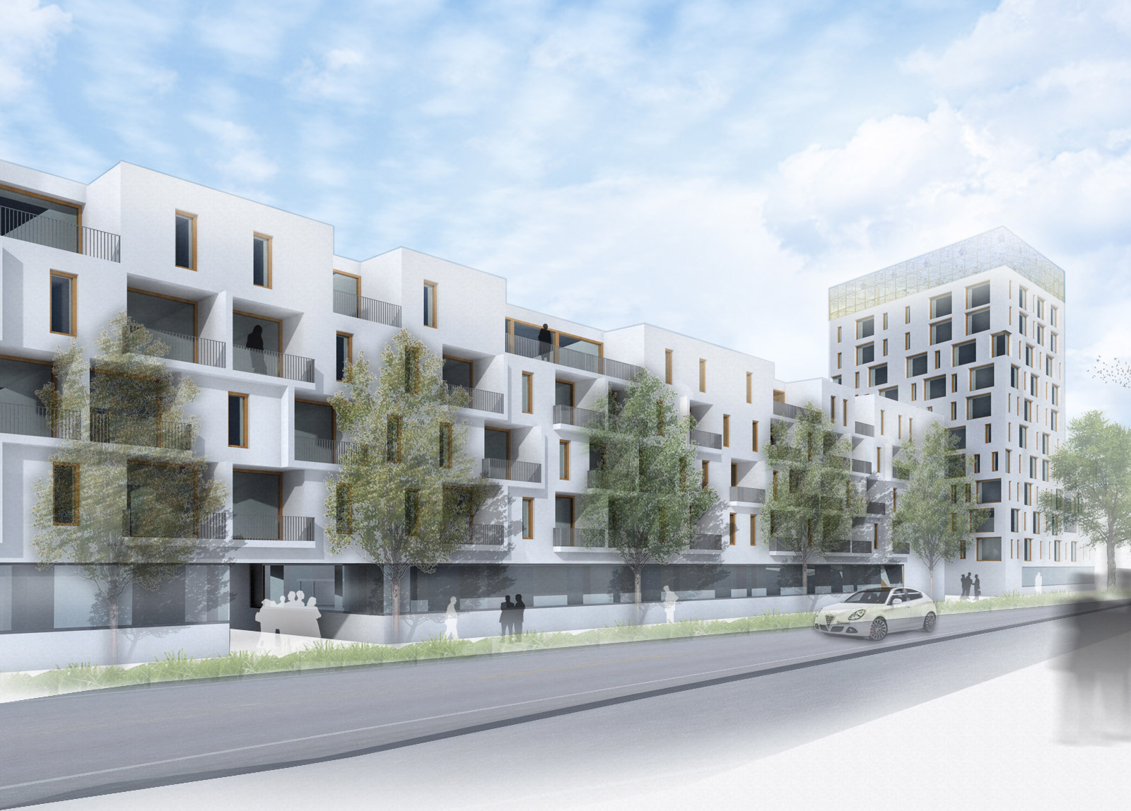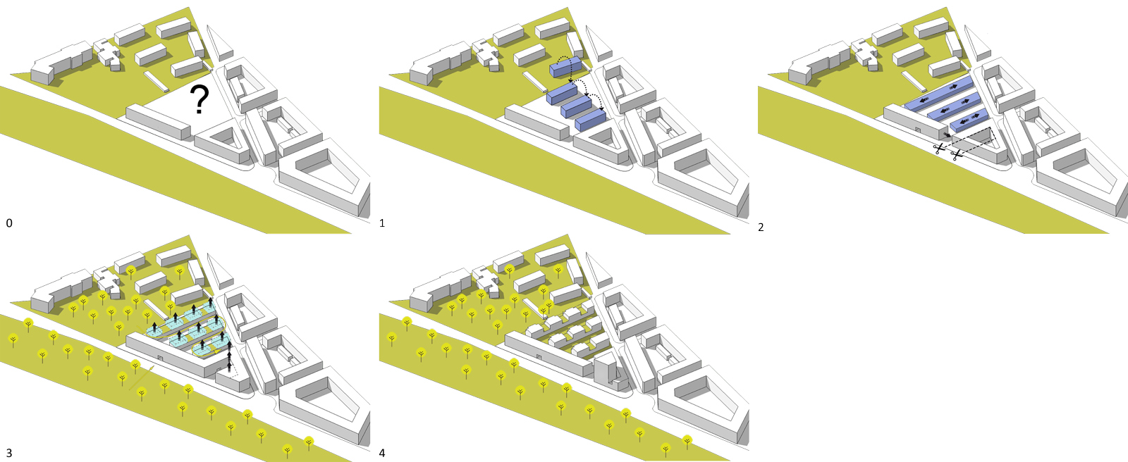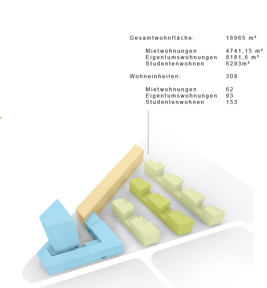 Die Bebauung trägt den unterschiedlichen Gegebenheiten Rechnung und unterscheidet in eine straßenbegleitende Bebauung mit Geschosswohnungsbau und Studentenwohnen und einer "Füllung" der Parzelle mit einer zeilenartigen Bebauung im Erdgeschoss, die sich in den oberen Geschossen zu Einzelhäusern ausdünnt. Während erstere ein eher städtisches Wohnen in Studentenappartements und 2 bis 5 Zimmerwohnungen mit Balkonen und Tiefgarage vorsieht, bieten die Einzelhäuser auf dem Sockelgeschoss und Tiefgarage ein durchgrüntes Wohnen mit Gärten, großen Balkonen und Dachterrassen.