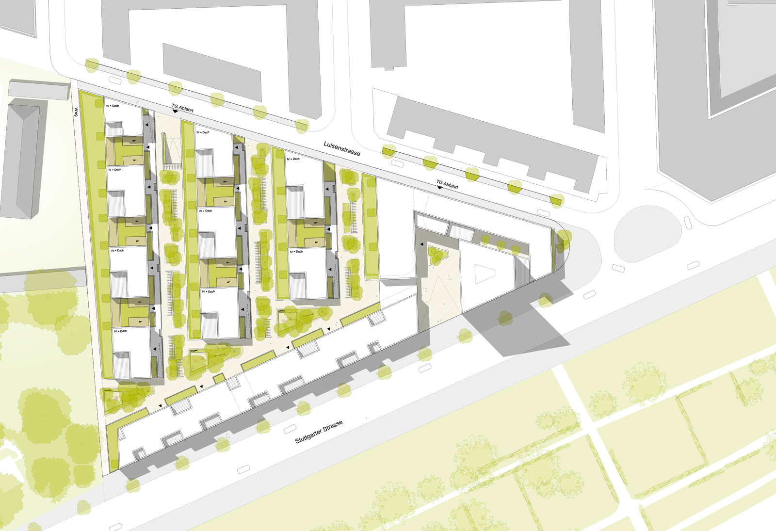 Mit einer neuen Bebauung nehmen wir beide Stadtstrukturen auf, den Blockrand und die Zeile und verknüpfen sie miteinander. Die verschiedenen städtebaulichen Richtungen werden aufgenommen und zusammengeführt. Es entstehen durchgrünte und ruhige Bereiche zum Wohnen innerhalb der Zeilen und eine klare städtebauliche Kante, die den Abschluss der Stadt definiert. Ein mäandrierender Baukörper, der zwischen Stuttgarter Straße und Luisenstraße vermittelt, streckt sich an der Kreuzung beider Straßen zum Turm. Er markiert den Eingang zum neuen Stadtteil.