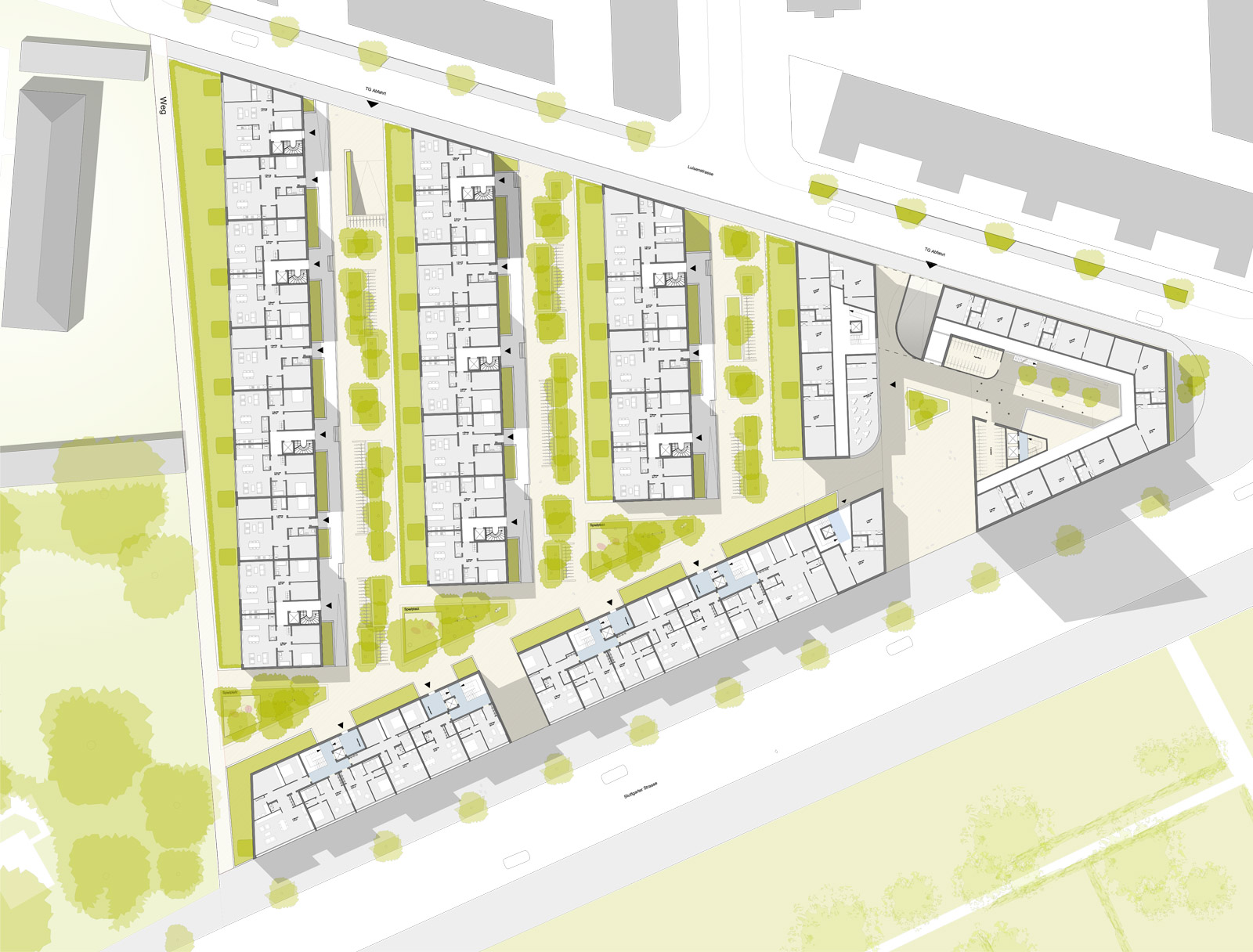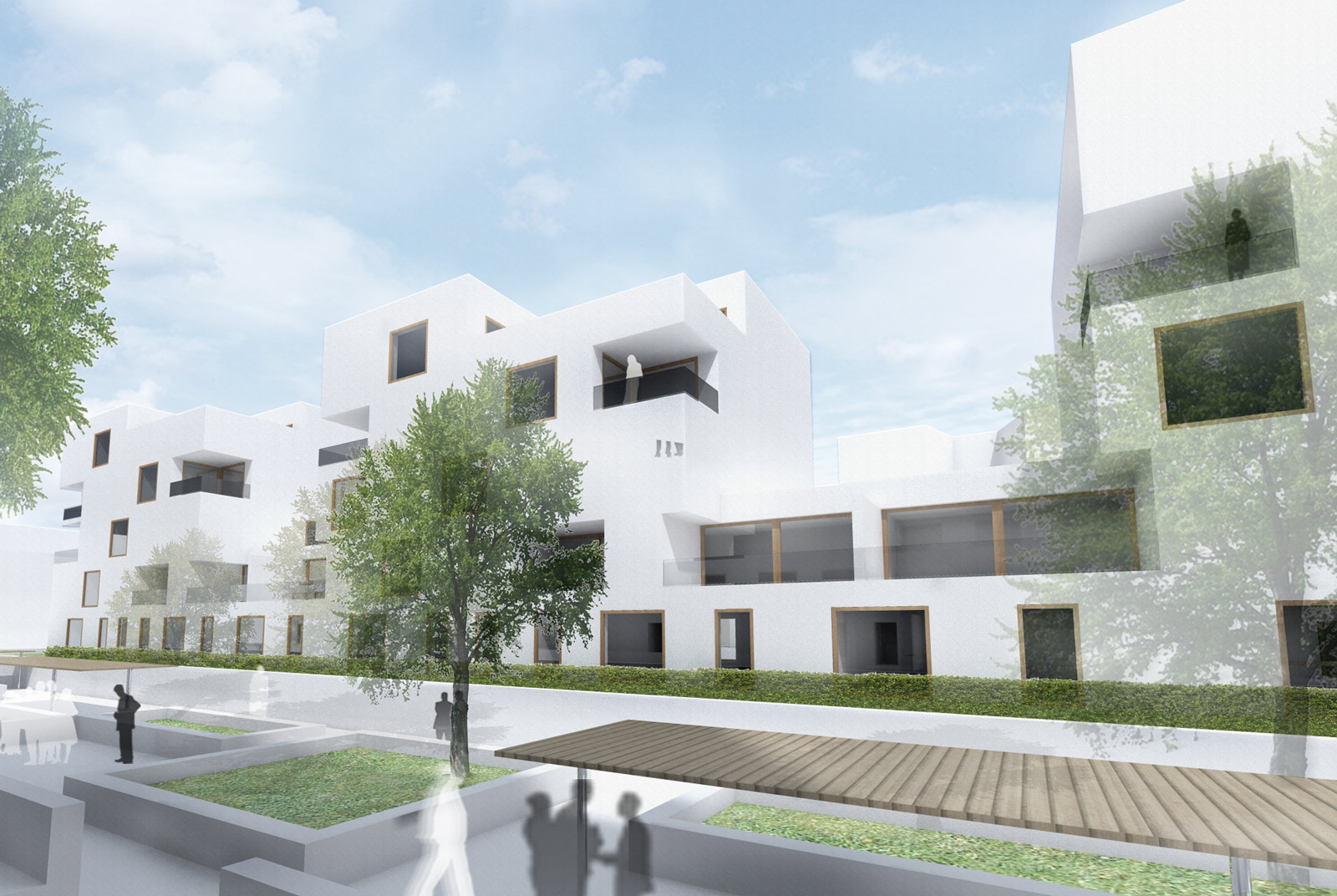 Die Eigentumswohnungen zeichnen sich durch helle, grßzügige Wohnungen aus, mit gut nutzbaren Gären, Loggien, dachgärten und Dachterrassen. Die Bebauung ist eine Art Hybrid zwischen Zeile und Einzelhaus. Zwischen den Mehrfamilienhäusern liegen im EG Wohnungen, die über einen eigenen Eingang verfügen, wie ein Reihenhaus. Teile des darüber liegenden Geschosses dienen zur Erweiterung der Mehrfamilienhäuser oder als deren Dachterrassen. In diesem modularen System lassen sich alle Wohnungsgrößen verwirklichen, bis hin zu einem Reihenhaus mitten in der Stadt.