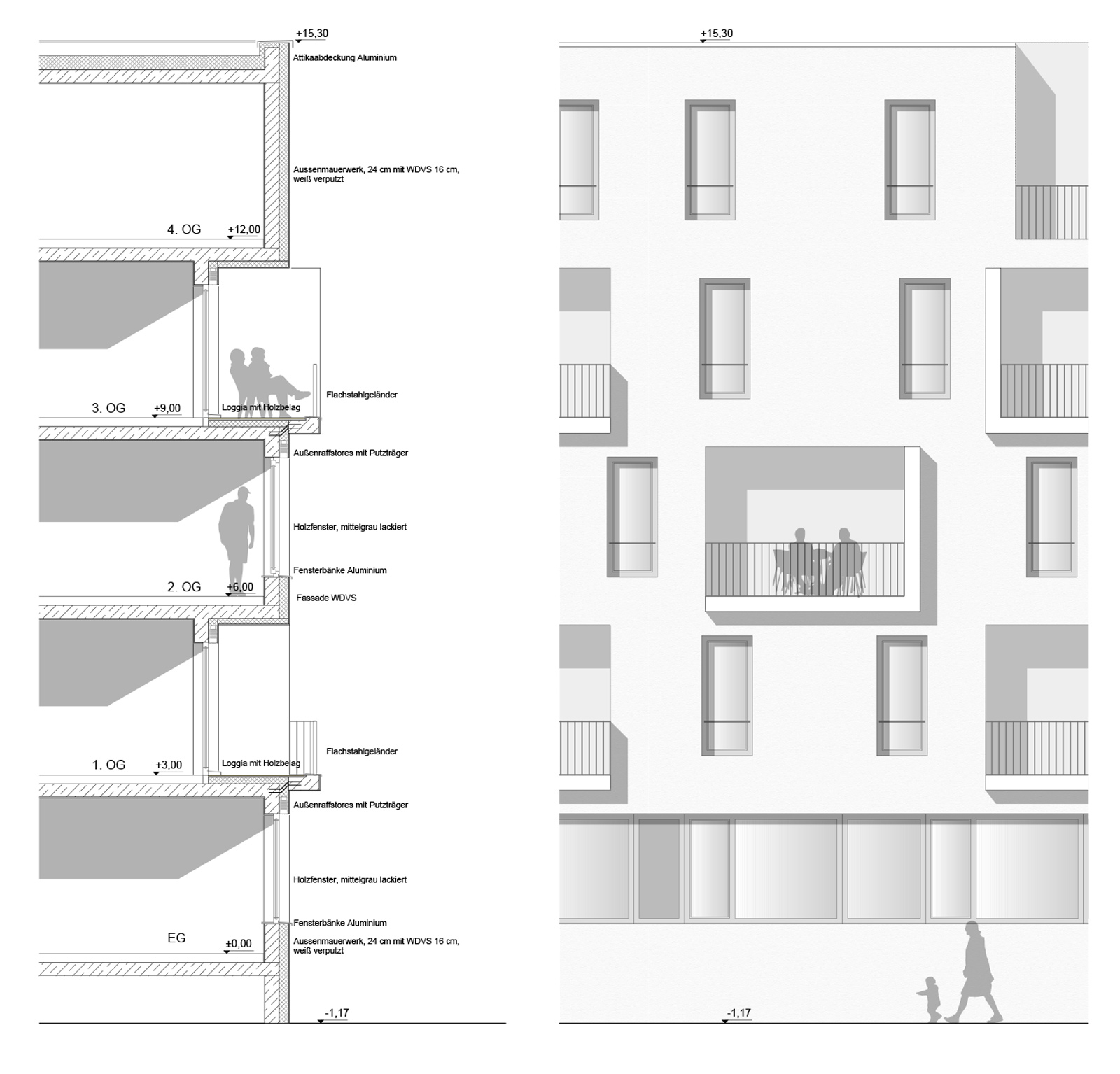 Die nach Süden ausgerichtete Wohnbebauung entlang der Stuttgarter Straße steht auf einem 90 cm hohen Sockel. Darunter liegen die gut belüfteten und belichteten Tiefgaragen und Kellerräume. Die Erhöhung des Erdgeschosses gegenüber der Straße und des Gehwegs schafft gut nutzbare Erdgeschosswohnung angeleht an die gründerzeitlichen Vorbilder. Über Aufzüge und Treppen werden bis zu drei Wohneinheiten erschlossen. Ab dem 1. Obergeschoss sind im Süden Loggien in den Baukörper geschnitten, die trotz der Straßenlage ein hohes Maß an Privatheit zulassen. Im Dachgeschoss liegen die Penthousewohnungen mit 2 Dachterrassen pro Wohnung, die einen Blick sowohl auf Karlsruhe als auch in Richtung Schwarzwald eröffnen. Die Wohnzeile wird über den Innenhof erschlossen. Ein großer Durchgang im Erdgeschoss in der Mitte der Zeile verbindet den Innenhof mit der Stuttgarter Straße.