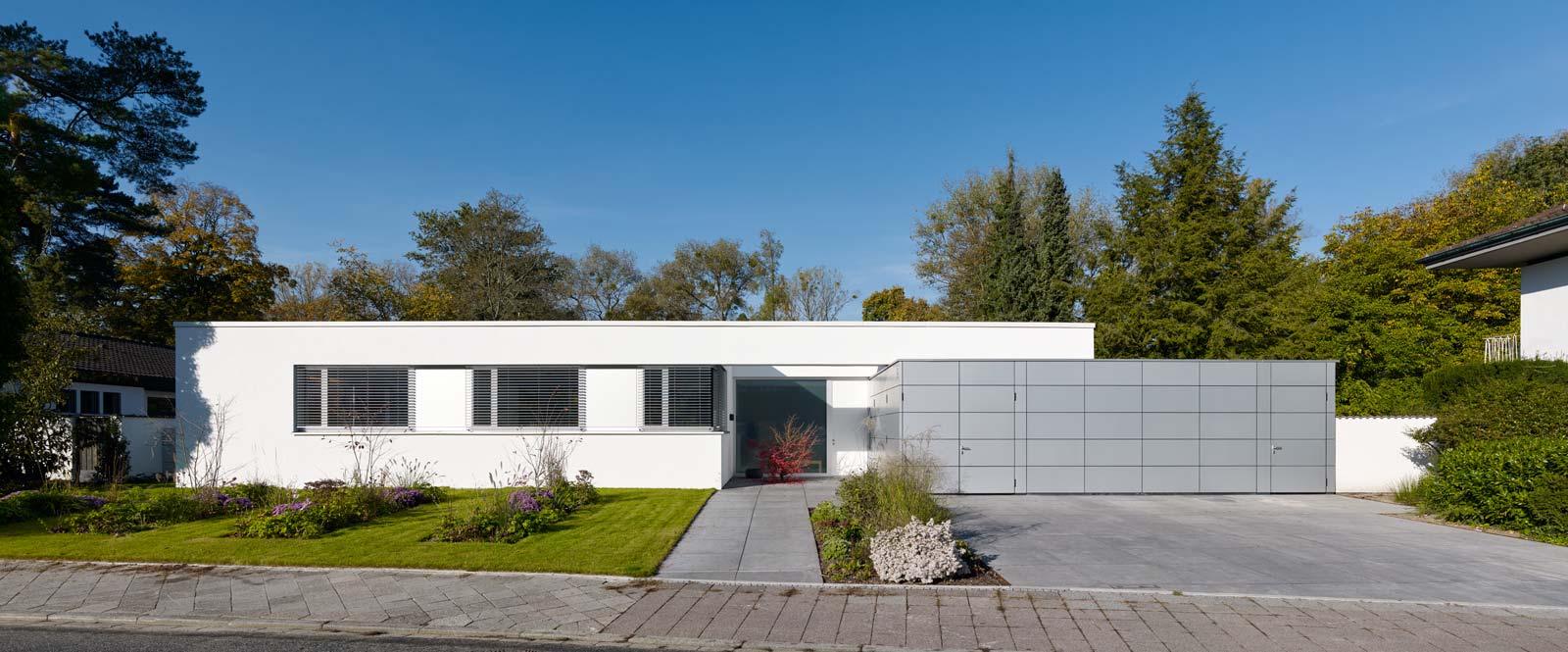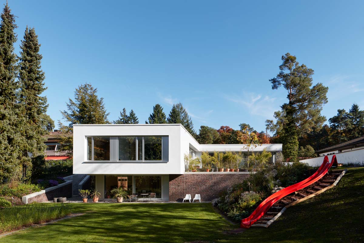 In der Waldstadt, einem stadtnahen, stark durchgrünten und mit alten Kiefern bewachsenen Stadtteil von Karlsruhe wurde dieses Einfamilienhaus auf einem großzügigen Grundstück errichtet. Das Gebäude erscheint von der Straße aus als klassischer eingeschossiger Bungalow und fügt sich dadurch wie selbstverständlich in die Umgebung. Die Zurückhaltung der Bauherrschaft ist ein Glücksfall für das Baugebiet. Das Konzept atmet den Geist der Gründungsväter ohne verstaubt zu wirken. Der winkelförmige eingeschossige Baukörper bildet in klassischer Weise einen geschützten Gartenbereich, um den sich Wohnen, Essen und Schlafen ordnen. Er sitzt auf einem Sockelgeschoss, das geschickt den Niveauversprung im hinteren Gartenbereich ausnutzt um das Arbeits- und die beiden Gästezimmer unterzubringen. Durch den winkelförmigen Baukörper, das Sockelgeschoss und das Abrücken des Garagenkubus entstehen ganz unterschiedliche Außenraumbezüge, vom Eingangshof über einen großen Garten, einem nicht einsehbaren Tiefhof bis hin zu einer kleinen Frühstücksterrasse.
