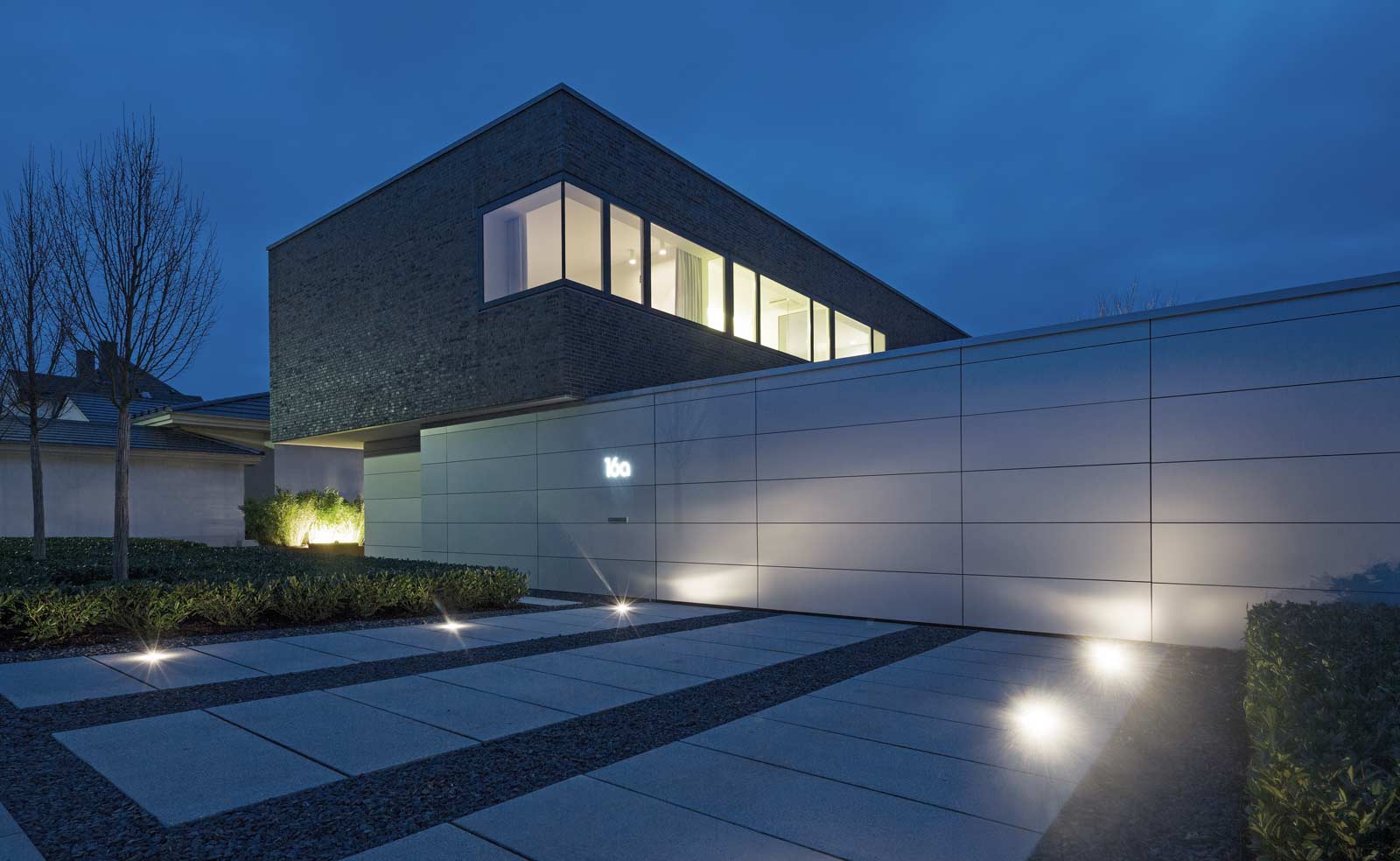 Der Ziegelstein als Formgebung – kantig, glatt, einfach steht der Baukörper auf dem kleinen Grundstück. Die der Straße zugewandte Ecke ist für den Eingang ausgeschnitten, hier schiebt sich ein zweiter, flacherer Gebäudeteil, der die Garage und Nebenräume beinhaltet, in den Hauptbau, eine industriell anmutende Aluminiumfassade durchschneidet den handwerklich konnotierten Ziegelstein.