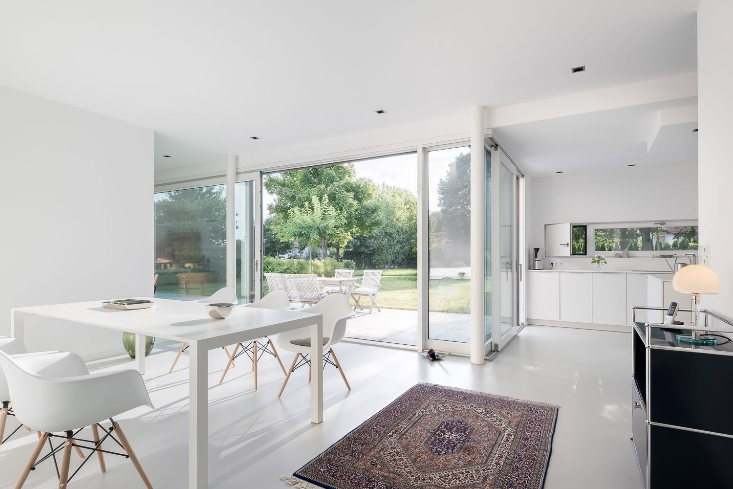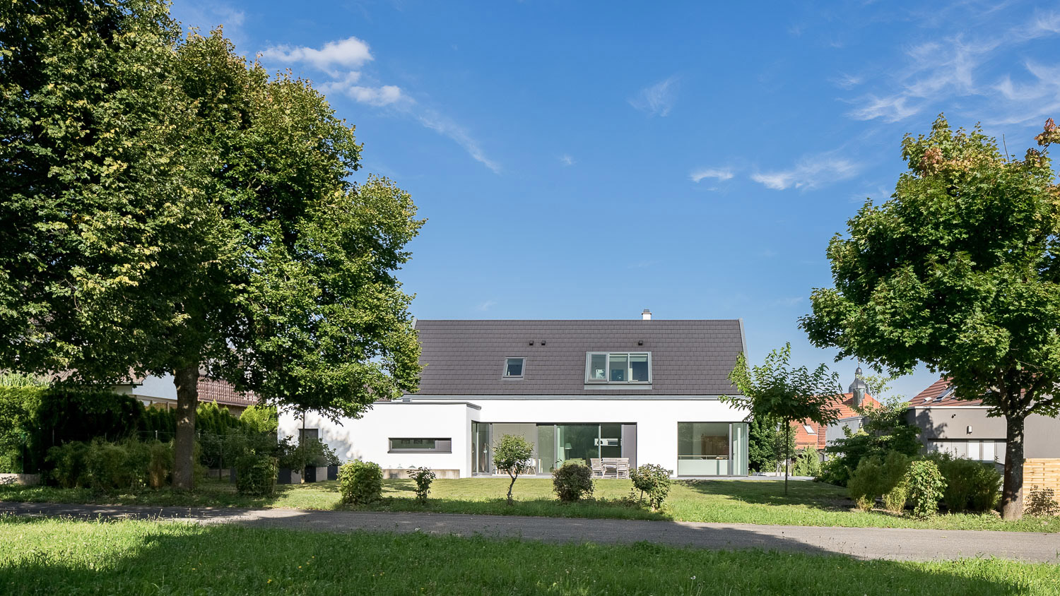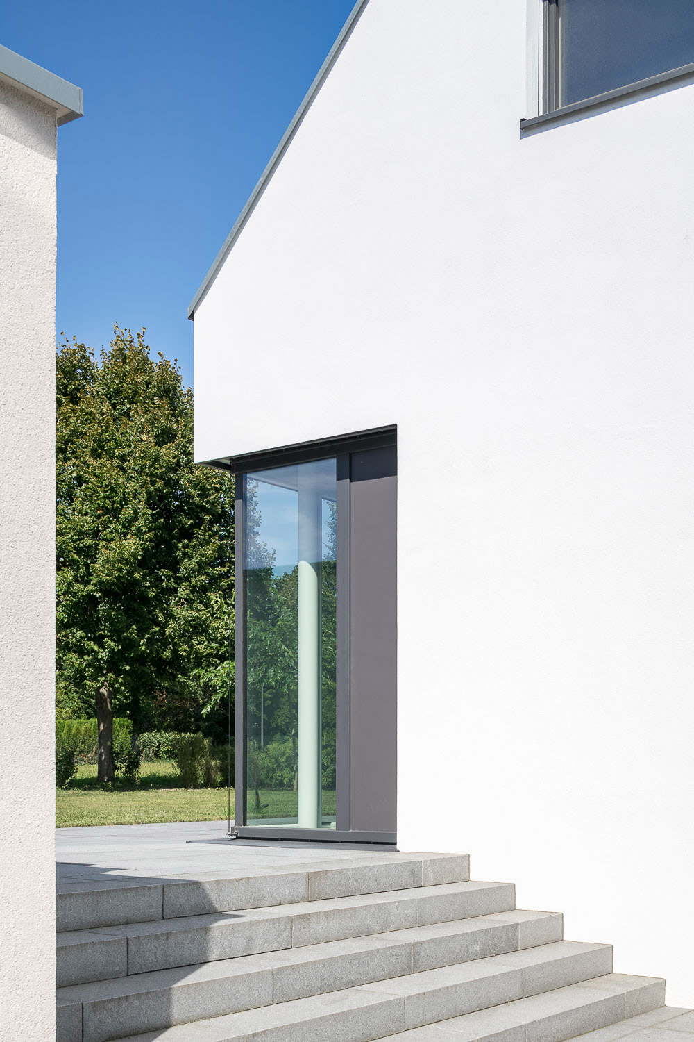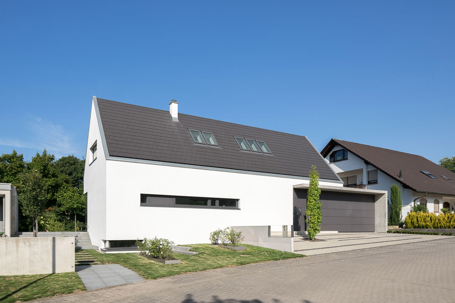 Das besondere an diesem Einfamilienhaus am Rande einer Kleinstadt ist seine innere Erschließung. Hier wurden nicht wie üblich die Treppen zur Erschließung der Stockwerke übereinandergelegt, sondern sind im Erdgeschoss an zwei Stellen verteilt. Was nach Raumverschwendung klingt, sorgt für großzügige räumliche Verbindungen innerhalb der Geschosse. Zur Straße zeigt sich das scharf geschnittene Steildachhaus eher geschlossen, zum Garten öffnet es sich mit großen Verglasungen. Hell und lichtdurchflutet präsentiert sich der Innenraum und lässt sich durch den offenen Grundriss in seiner ganzen Länge erleben. Der schmale lange Baukörper mit seinem steilen Dach kommt ganz ohne Gauben aus und wirkt wohltuend ruhig in der sonst sehr bewegten Dachlandschaft des Einfamilienhausgebiets.