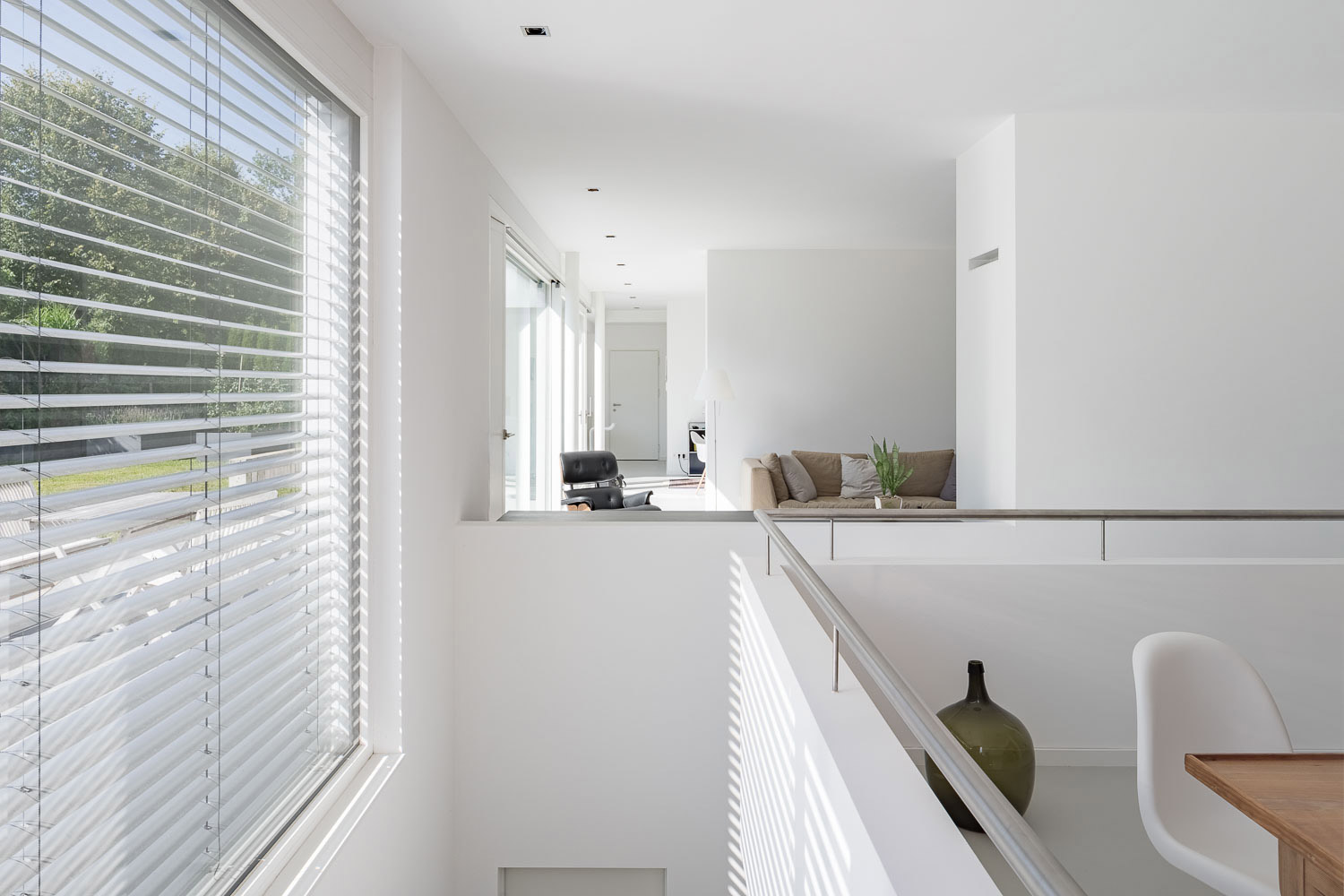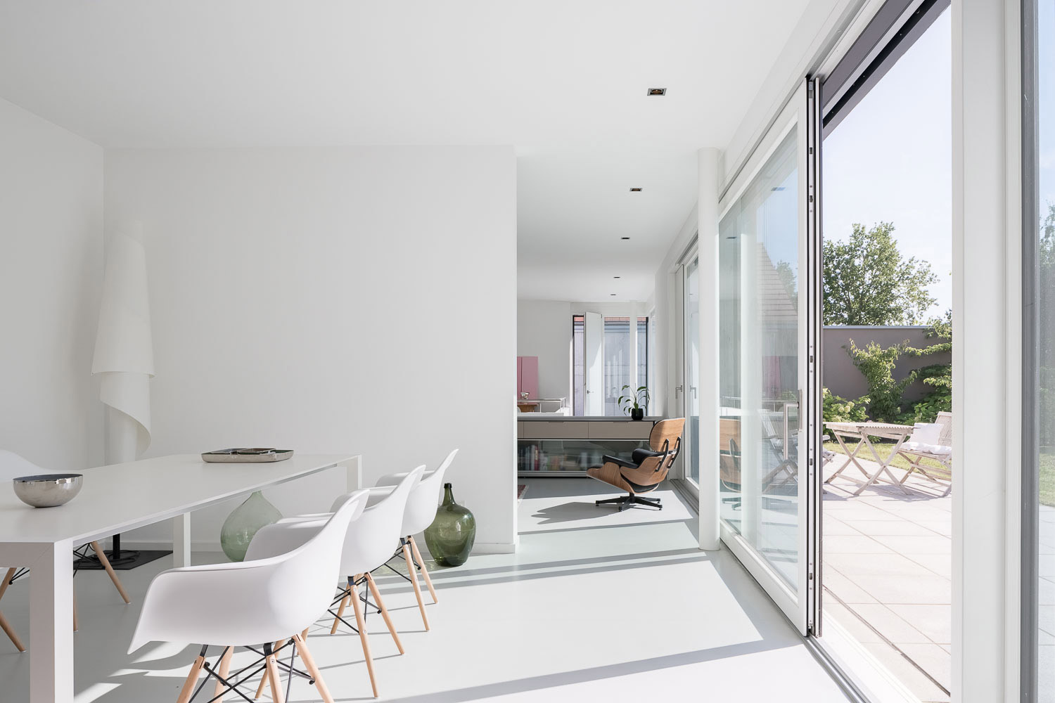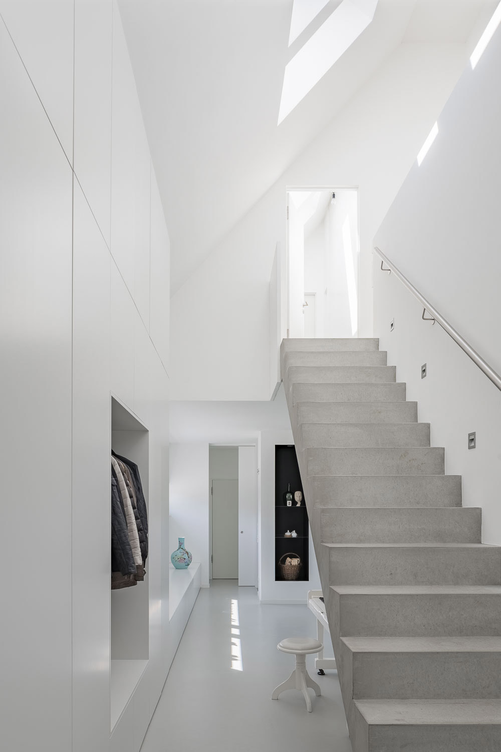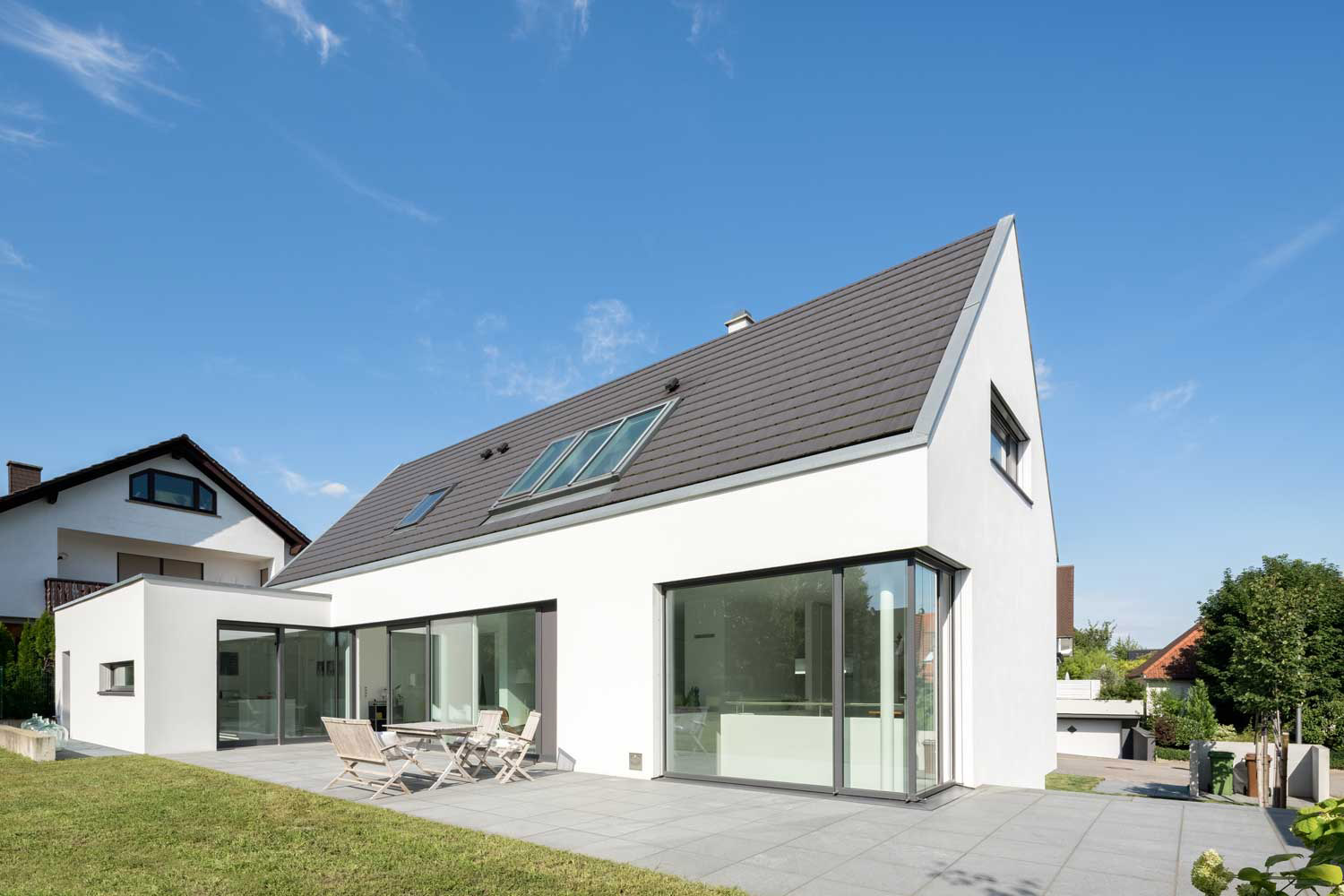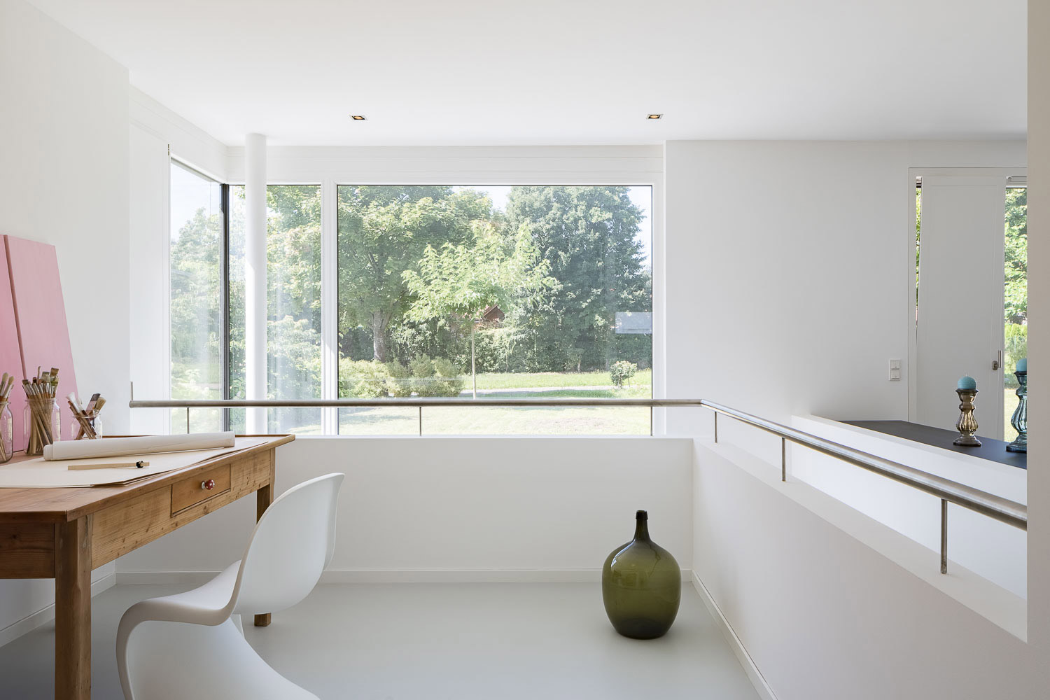 Das besondere an diesem Einfamilienhaus am Rande einer Kleinstadt ist seine innere Erschließung. Hier wurden nicht wie üblich die Treppen zur Erschließung der Stockwerke übereinandergelegt, sondern sind im Erdgeschoss an zwei Stellen verteilt. Was nach Raumverschwendung klingt, sorgt für großzügige räumliche Verbindungen innerhalb der Geschosse. Zur Straße zeigt sich das scharf geschnittene Steildachhaus eher geschlossen, zum Garten öffnet es sich mit großen Verglasungen. Hell und lichtdurchflutet präsentiert sich der Innenraum und lässt sich durch den offenen Grundriss in seiner ganzen Länge erleben. Der schmale lange Baukörper mit seinem steilen Dach kommt ganz ohne Gauben aus und wirkt wohltuend ruhig in der sonst sehr bewegten Dachlandschaft des Einfamilienhausgebiets.