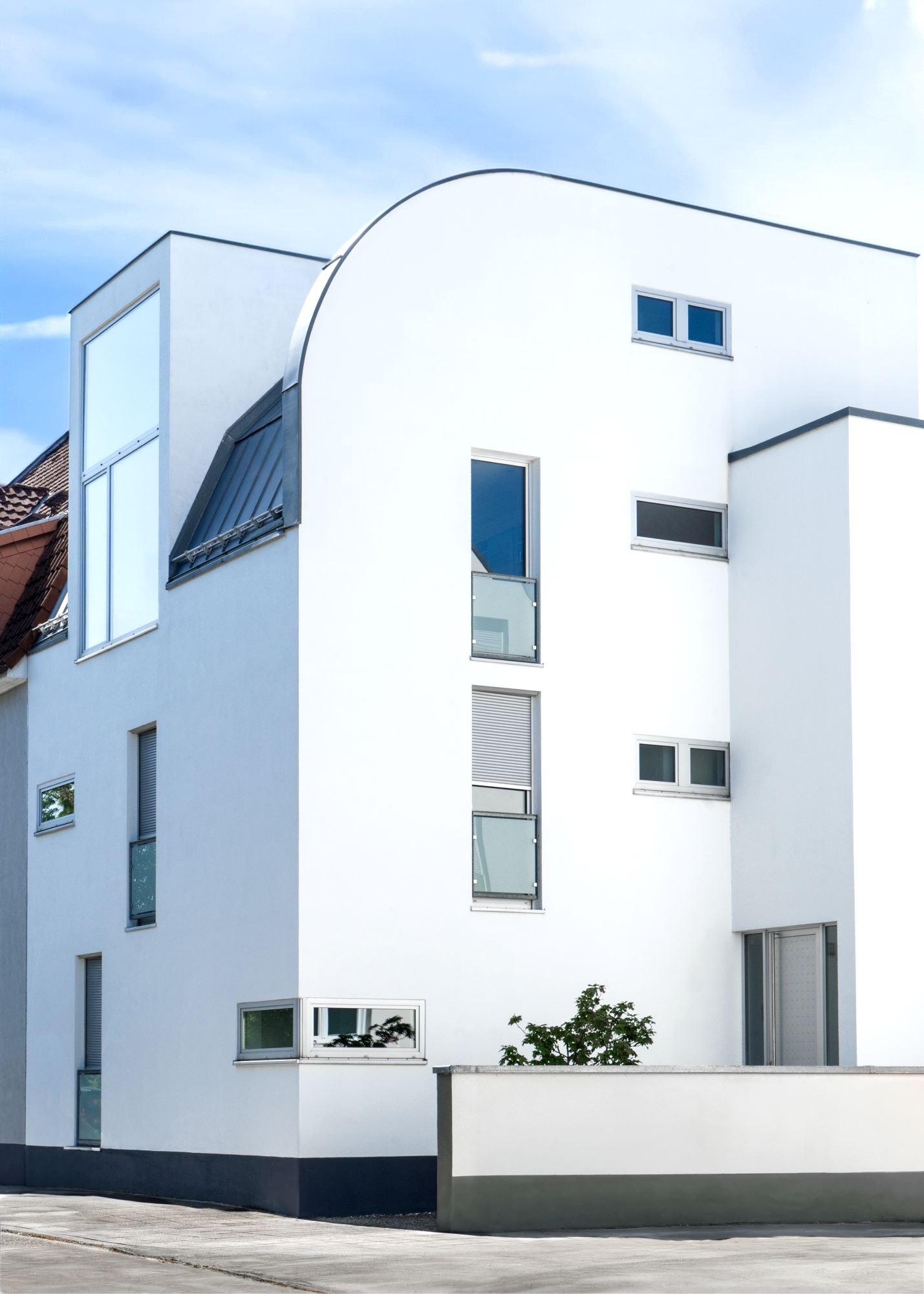 Das Mehrfamilienhaus befindet sich in einer vorstädtischen, gleichwohl dörflich anmutenden Umgebung und markiert das Ende eines in diesem Kontext etwas kurios anmutenden, weil „städtischen" Blockrands. Der erste Entwurf sah ein reines Flachdachgebäude mit zurückgestaffelten Dachgeschossen vor. Nach langwierigen und schwierigen Verhandlungen mit den zuständigen Behörden der Stadt einigte man sich schließlich auf einen Kompromiß: vier Vollgeschosse für drei Wohneinheiten, straßenseitig dem angrenzenden Mansarddach angepasst. Im Gegenzug gewährte die Stadt eine höhere Grundstücksausnutzung und Befreiungen bei den Abstandsregelungen.