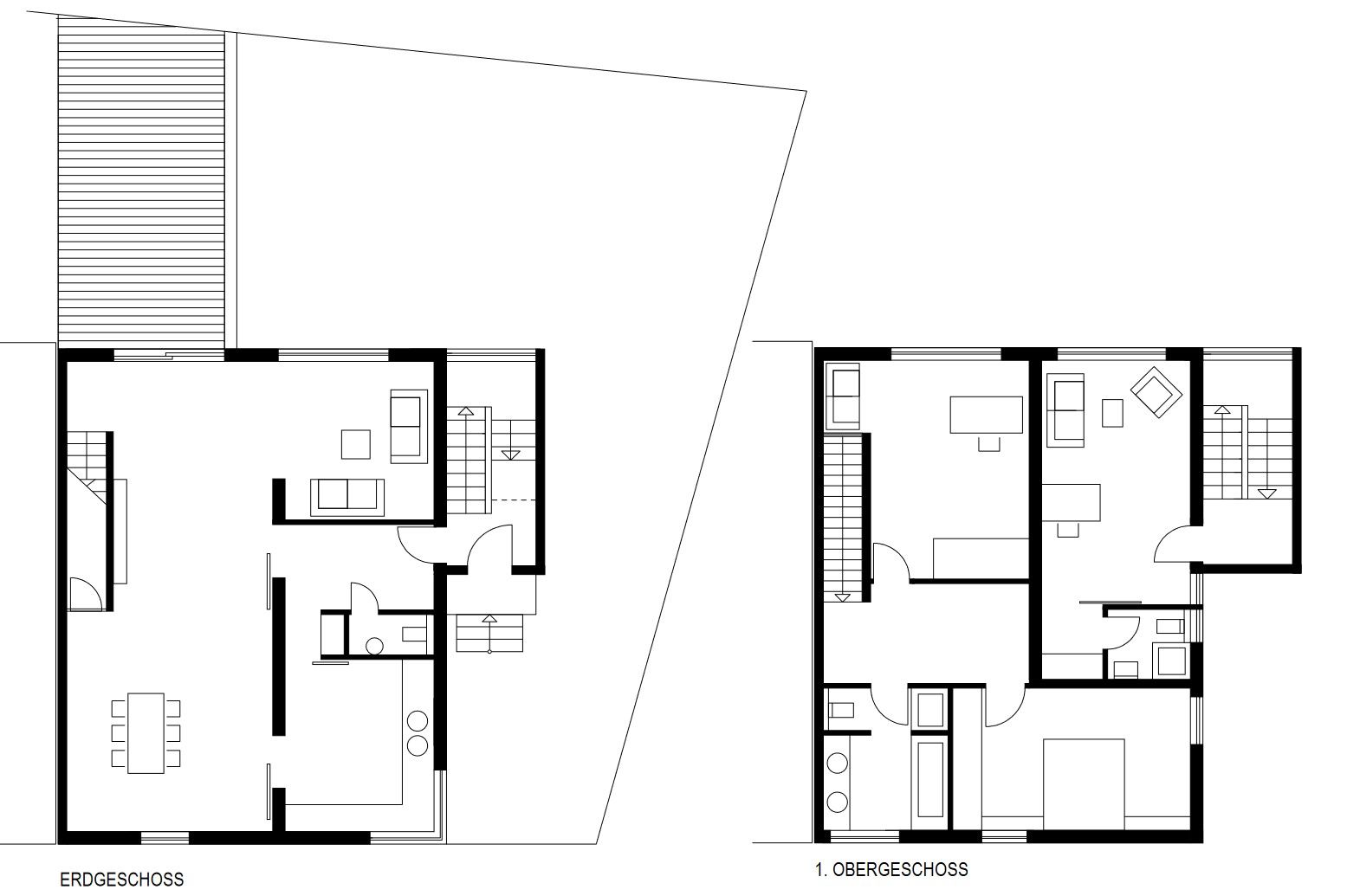 Während die Südseite zu den angrenzenden Gartengrundstücken fast vollflächig verglast ist, lassen Straßen- und Giebelfassade nur an exakt definierten Punkten Ausblicke und Lichteinfall zu. Die Übergänge der einzelnen Räume untereinander sind fließend, allenfalls durch Schiebewände trennbar. Die interne Erschließung erfolgt über eine einläufige, hinter einer Wandscheibe verborgenen Treppe. Einbauschränke gliedern die verschiedenen Bereiche in öffentlichere und privatere Zonen. Auch die technischen Einrichtungen wurden dem formal reduzierten Innen-raumkonzept unterworfen.