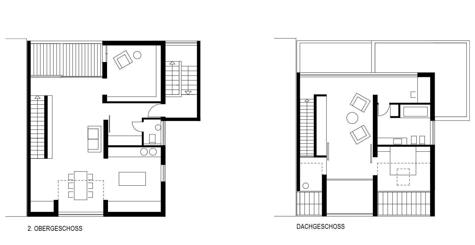 Das Gebäude ist sehr einfach aufgebaut: zwei ähnlich konzipierte, übereinander-gestapelte Maisonetten werden um ein kleines Appartement für den Sohn der Bauherrin ergänzt, das zu einem späteren Zeitpunkt der unteren Wohnung zugeschaltet werden kann. Die giebelseitig angesetzte Erschließung gewährleistet eine maximale Freiheit in der Grundrißgestaltung des Kubus. Die obere Maisonette ist ganz auf die Bedürfnisse der Bauherrin zugeschnitten und dementsprechend offen gestaltet. Sie verfügt über einen Luftraum, an dessen straßenseitiger Aus-formulierung in Form eines Gegengiebels die wahre Geschossigkeit ablesbar bleibt. Das Giebelthema der Nachbarbauten aus der Jahrhundertwende wird in eine zeitgenössische Formensprache übersetzt. Zugleich wird durch die Grundriß-geometrie der Galerieebene im Innern jeder Eindruck eines Dachgeschosses vermieden.