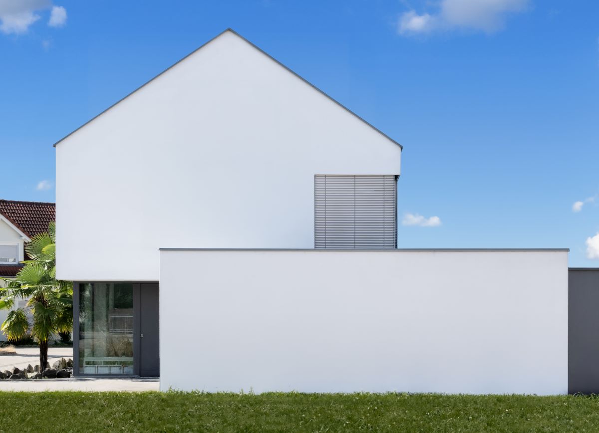 Bauen im dörflichen Kontext bedeutet, mit einfachen Geometrien und Volumina zu arbeiten. In diesem Fall waren nicht nur das Raumprogramm für eine Familie, sondern zusätzlich Seminarräume für die freiberufliche Tätigkeit der Bauherrin unterzubringen, ohne dass das Haus dadurch maßstäblich aus dem Rahmen fallen durfte. Der nahezu vollständig geschlossenen Straßenfassade steht eine vollverglaste Gartenfront gegenüber, die die Lagegunst des Grundstücks ausnutzt.