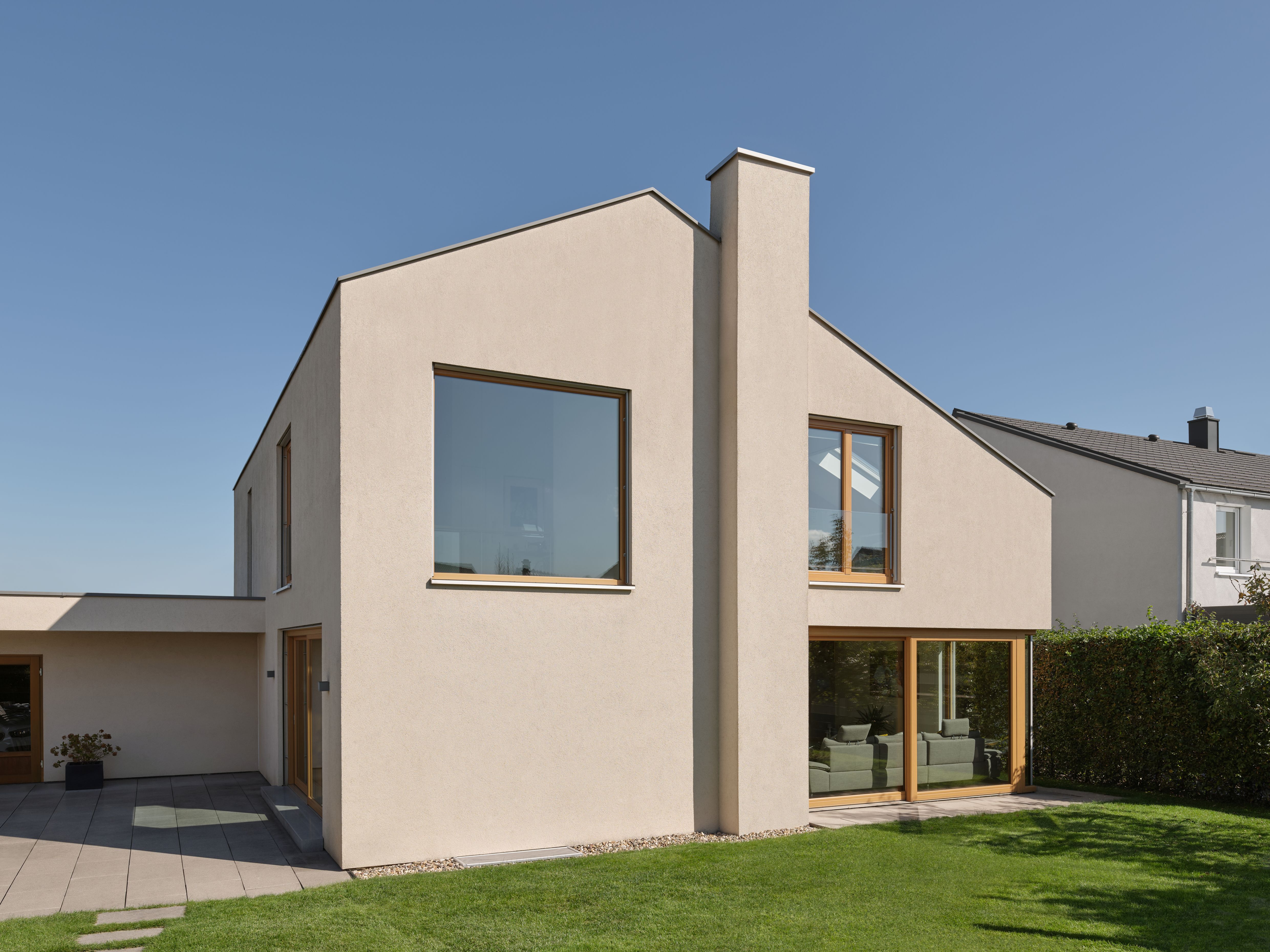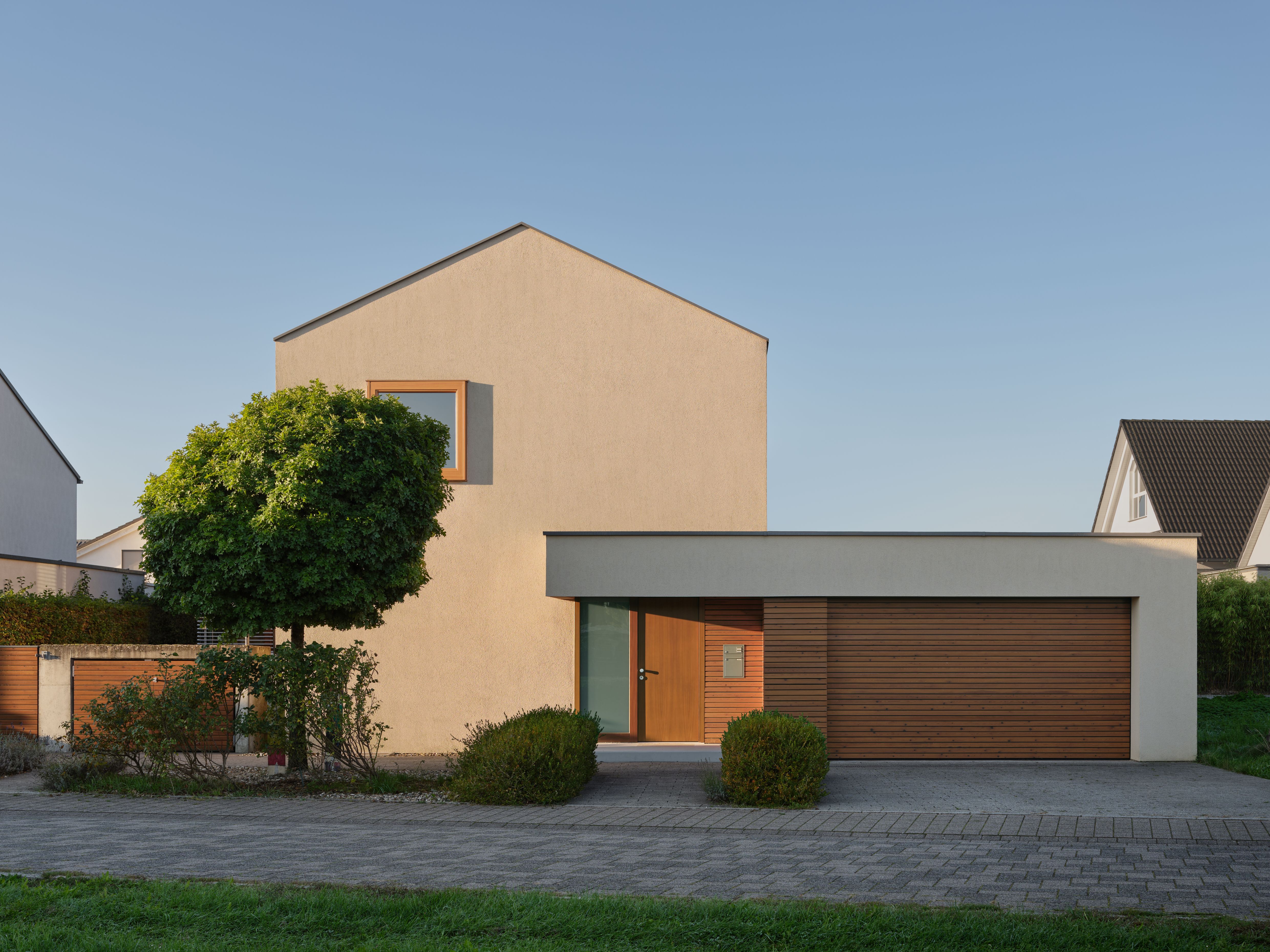 Unsere Reaktion auf das heterogene Umfeld eines Neubaugebiets besteht in der Reduktion auf die „einfache Form": ein klassischer Satteldach-Baukörper mit scharf geschnittenem Giebel, im leicht vorgezogenen Flachbau Eingang und Garage integriert, Schutz gebend zur Straße, offen zum Garten. Ein einziges, schön gefasstes Fenster auf der Straßenfront, äußerste Beschränkung in der Materialwahl und ruhige, überlegte Proportionen geben dem kleinen Haus jene Großzügigkeit, die wir in unseren seelenlosen Wohngebieten oft so schmerzlich vermissen.