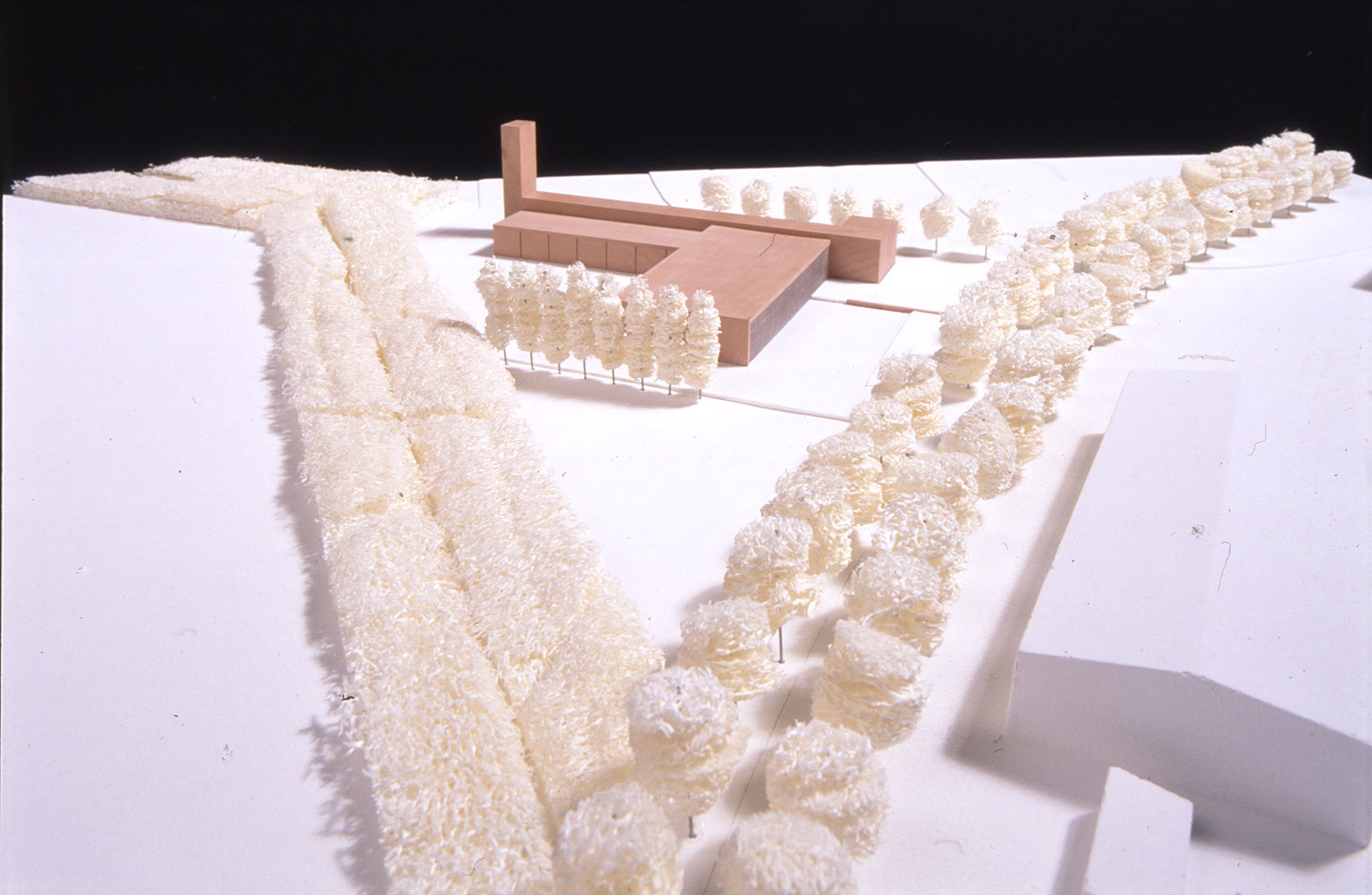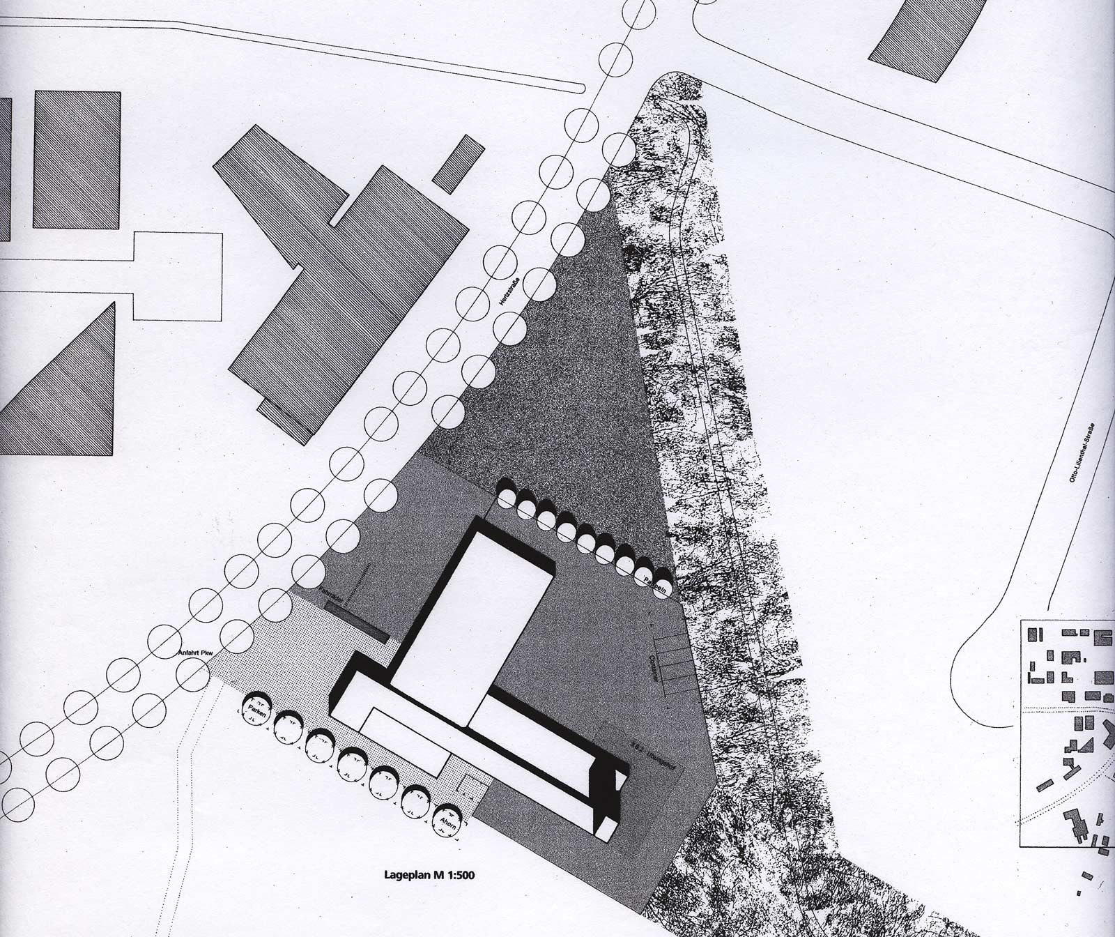 An diesen Vorgaben orientiert sich der Entwurf: in Analogie zu den Solitärbauten der Stadtwerke sowie des Reiterhofs verhält sich das Gebäude orthogonal zur Krümmung der Straße. Der Neubau der Feuerwehr besetzt die südliche Grenze des städtischen Grundstücks. Es gelingt auf diese Weise, die für den reibungslosen Feuerwehrbetrieb notwendigen Freiflächen sinnvoll anzuordnen.