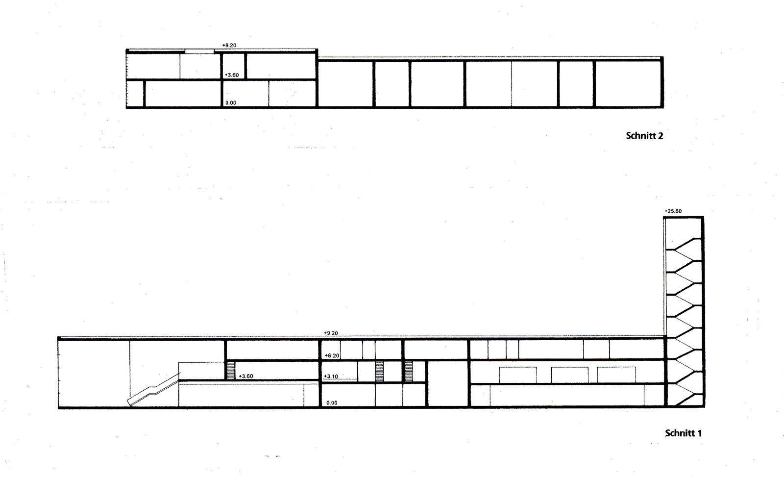 Die fünf unterzubringenden Bereiche werden entsprechend ihrem Verhältnis zum laufenden Feuerwehr- betrieb in drei verschiedenen Gebäudetrakten zusammengefasst. Diese drei in sich abgeschlossenen, autarken Bereiche werden zueinander gefügt und bilden so die Grundform des Gebäudes. Verzahnt werden sie von der Bewegung des dreigeschossigen Gebäuderückens, der – beginnend im Foyer und die Länge der Schlaucheinheit aufgreifen - in die Höhe des Turmes übergeht. Die Komplexität der inneren Verknüpfung lässt eine expressive, die Funktion der Feuerwehr unterstreichende Gebäudeform mit hohem Identifikationswert entstehen.