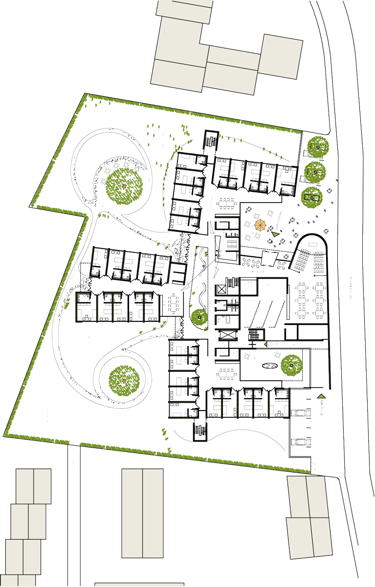 Der Entwurf bietet die räumliche Gliederung in einen öffentlichen und in einen geschützten, privateren Bereich. Der öffentliche Bereich beinhaltet den Kirchsaal, Speisesaal, Kiosk und ein Cafe im Hof. Dieser Bereich öffnet sich nach außen, ist Treffpunkt für Bewohner, Besucher und Passanten und lädt zum Verweilen ein. Kirchsaal und Speisesaal sind zusammenschaltbar und unabhängig vom Wohnbereich zu erschließen; sie bieten damit Raum für kulturelle Veranstaltungen und stellen eine Bereicherung für den gesamten Ortsteil dar. Die Eingangshalle bietet die erste Orientierung für Bewohner und Gäste; Kirchsaal, Speisesaal, Kiosk/Empfang und Zugang zu den Wohngruppen können auf einen Blick erfasst werden.