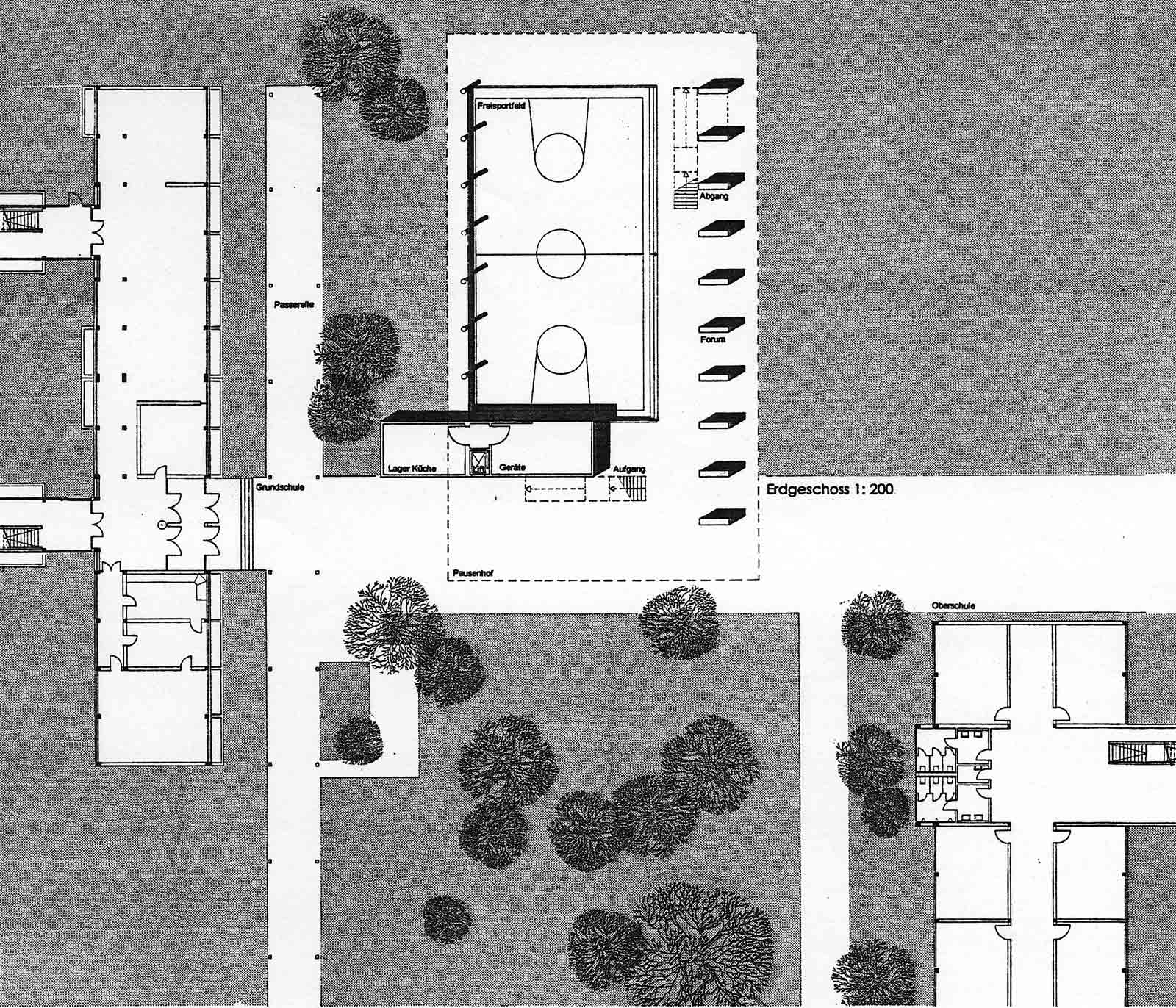 Die eigentliche Aula, bestehend aus einem dreiseitig verglasten, U-förmigen Bügel aus Stahlbeton, schafft durch die Lösung vom Boden neue, eigenständige Räume, die als Pausenüberdachung oder Freisportfeld künftige Nutzungen in Teilen vorwegnehmen. Die Erweiterung um eine Gymnastikhalle kann unter dem Gebäude auf einfachste Weise erfolgen, ohne wegen des hohen Grundwasserstandes baukonstruktiv aufwändige Abdichtungsmaßnahmen ergreifen zu müssen.