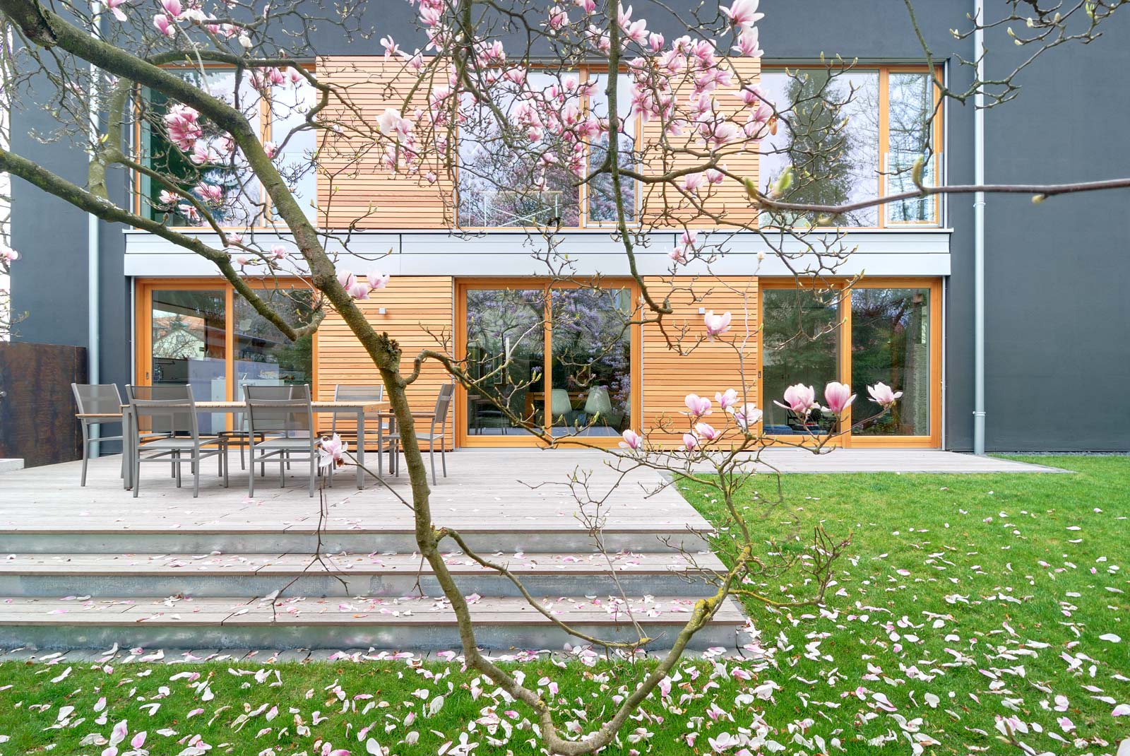 Herzstück des Hauses ist die Küche, deren großes Kastenfenster zur Straße hin orientiert ist. Von ihr aus gelangt man auch auf die Terrasse, die im Sommer den Wohn- und Essbereich über große Schiebetüren mit dem Garten verbindet. Das Lärchenholz der Fenster prägt die Fassadengestalt und gibt dem dunklen Putzbau die nötige Wärme und Heiterkeit.