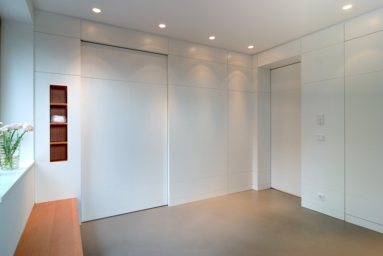 Auf eine Galerie wurde zwar verzichtet, doch schafft der Treppenraum eine galerieähnliche Atmosphäre. Die Behandlung der öffentlichen Zonen in den einzelnen Ebenen folgt einem einheitlichen, verbindenden Gedanken: alle Flurwände sind Funktionsträger und mit den unterschiedlichsten Einbauschränken versehen, die Zimmertüren sind in die Holzvertäfelungen integriert und jede noch so kleine Nische wurde mit einer Funktion belegt - überall lässt sich etwas öffnen, schieben oder klappen, das Haus ist nicht nur für die Kinder ein "großes Spielzeug".