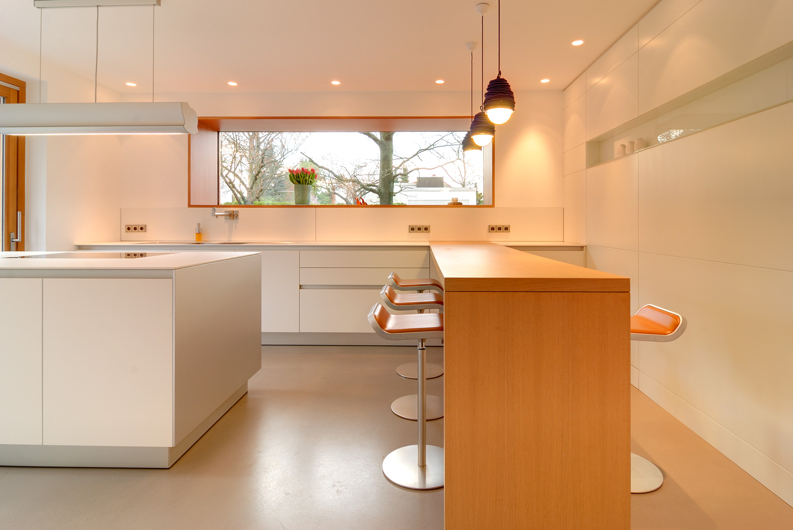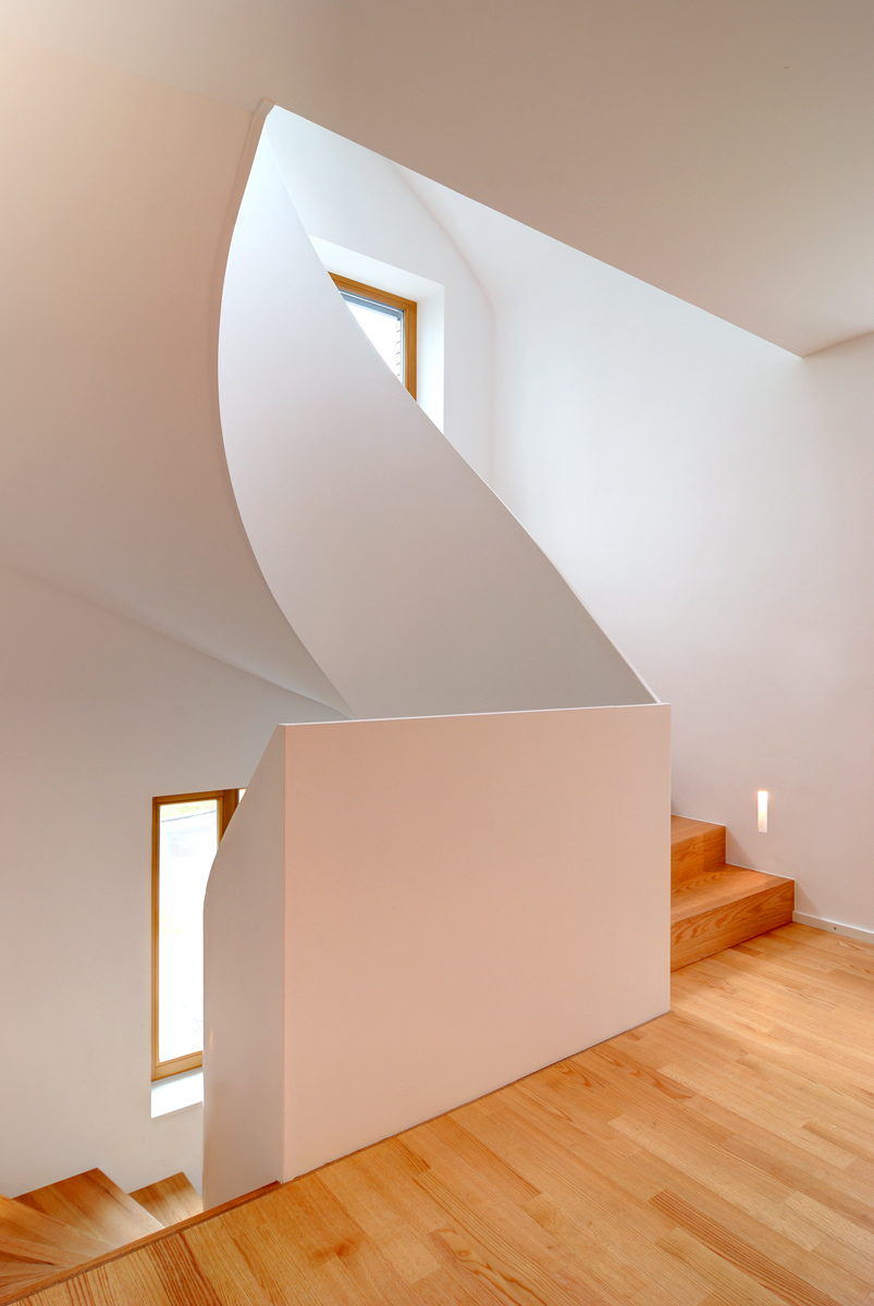 Die klare Funktionstrennung des Bestandsgebäudes wurde beibehalten: im Erdgeschoss befinden sich die Gemeinschaftsräume, wie Kochen, Essen und Wohnen, solange die Kinder noch klein sind und das Dachgeschoss bleibt zunächst dem Arbeiten sowie den Gästen vorbehalten; später wird es der Rückzugsraum der Eltern werden. Innerhalb dieser Struktur wurden jedoch vielfältige Änderungen vorgenommen: die Grundrisse wurden gestrafft, es entstand ein großzügiger Eingangsbereich mit Windfang. Entrée und Garderobe, die halbgewendelte Treppe wurde skulptural umbaut, sodass sie als durchgängiges Bauteil die einzelnen Etagen auch optisch miteinander verbindet.