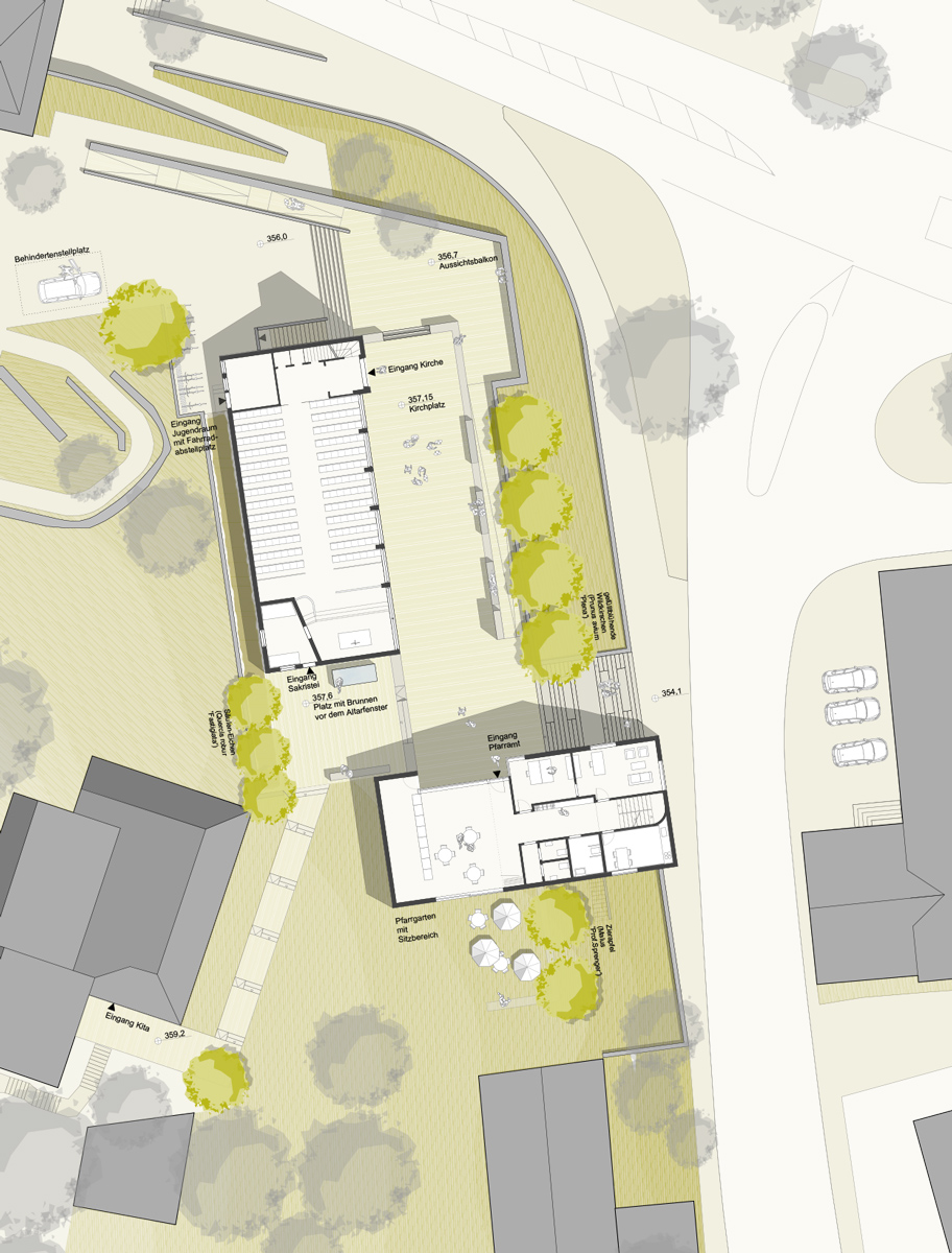 Leitgedanke der Platzräume und Erschließungsflächen ist die weitestgehend barrierefreie Durchwegung des hängigen Geländes vom Tannenweg bis zur Bahnhofs- bzw. Grabenstraße. Dazu wird talseitig vor der Längsseite der Kirch eine große Platzfläche ausgebildet, die durch eine Baumreihe zur Grabenstraße hin begrenzt wird.