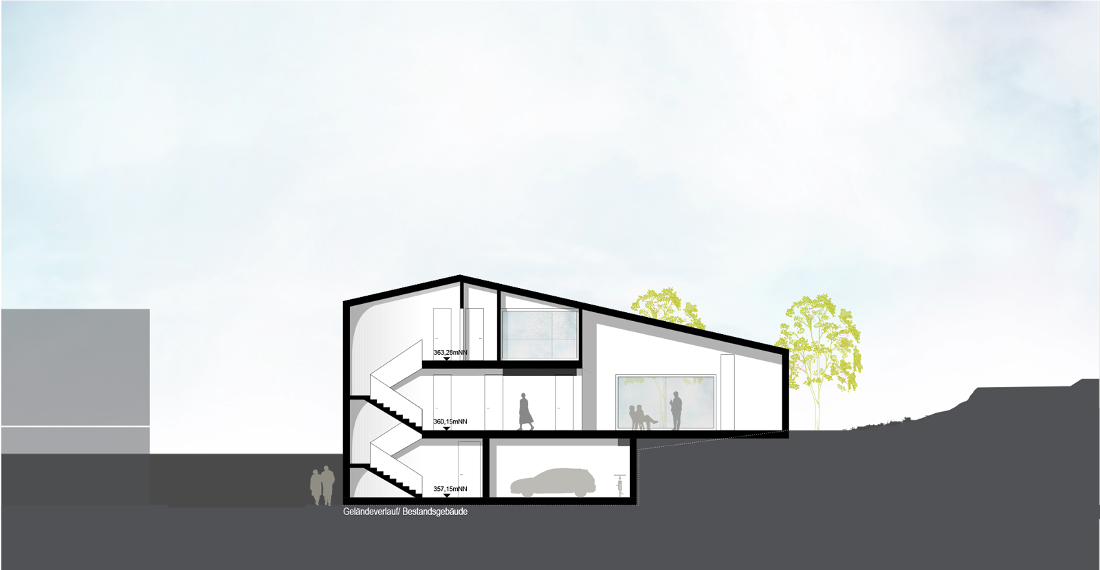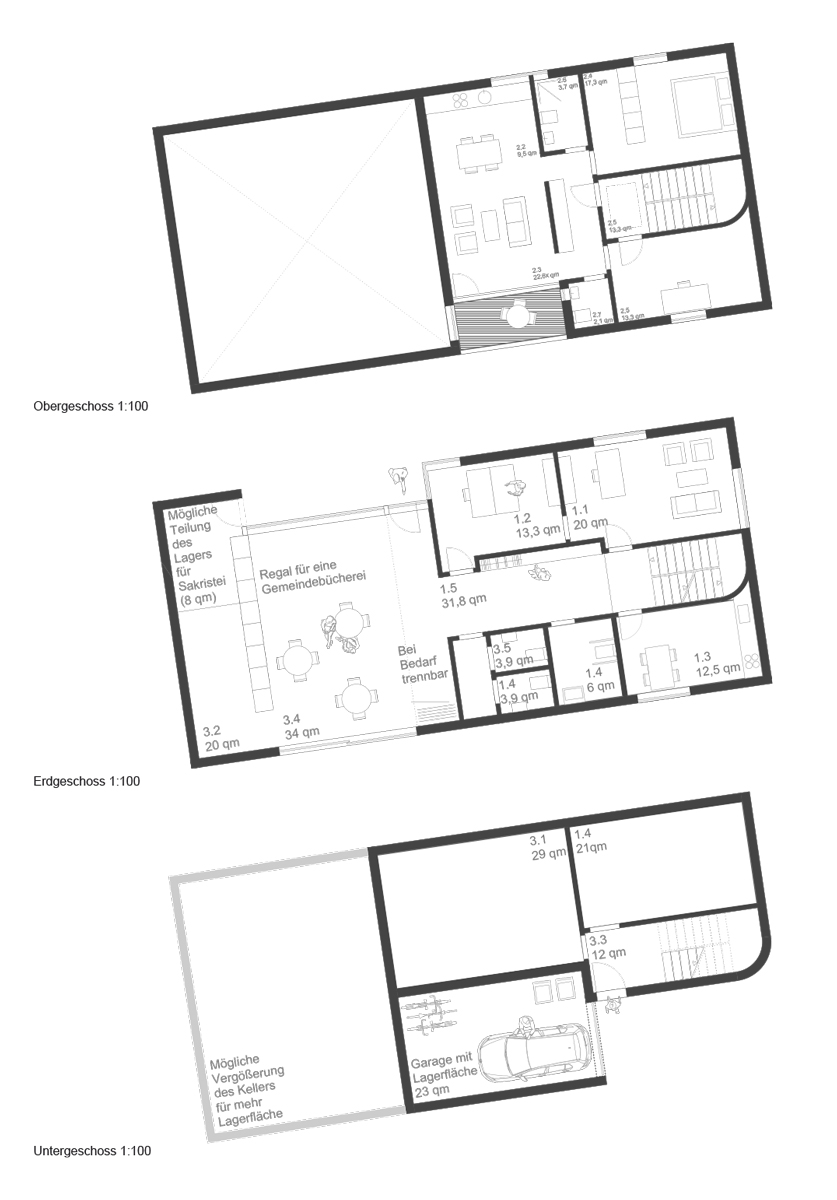 Das Pfarrhaus selbst verfügt über drei Ebenen und ist hart an die Straßenkante gesetzt. Neben einer Garage befindet sich hier der Eingang zur Pfarrwohnung, die unter dem großen, alles überspannenden Satteldach Platz findet. Durch die Option einer Vollunterkellerung können hier unten zudem weitere Abstellflächen geschaffen werden.