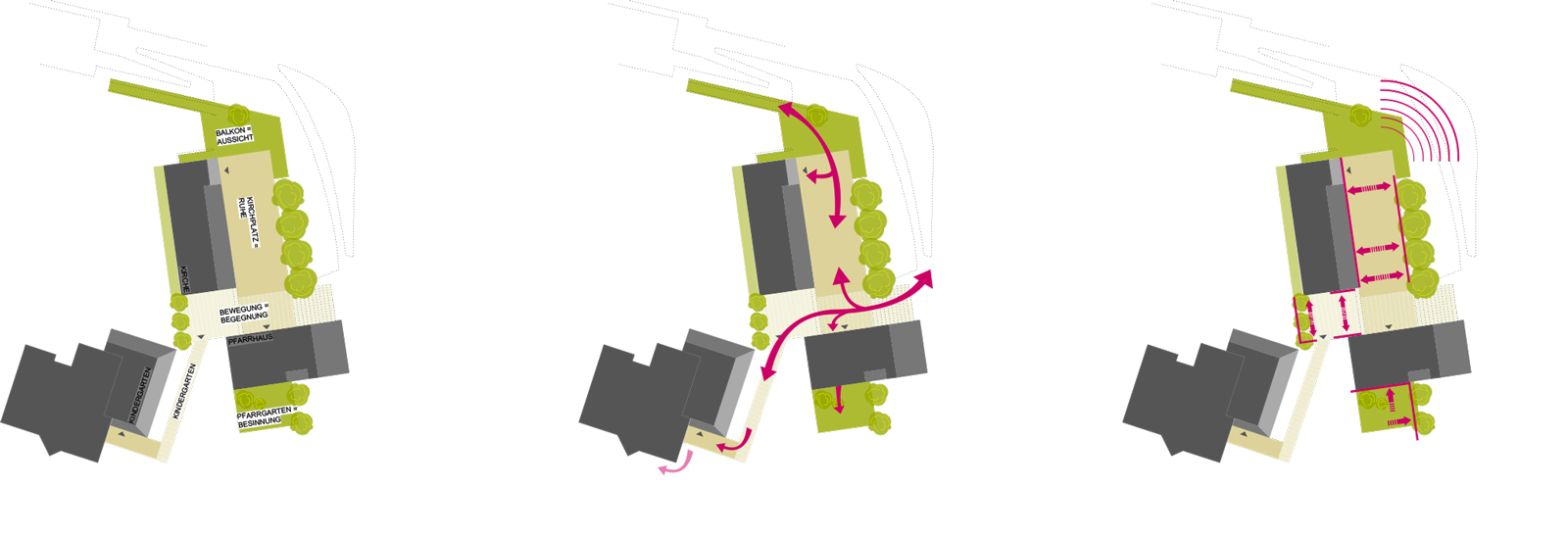 Dafür rückt der Neubau des Pfarrhauses so weit von der Kirche ab, dass ein großzügiger Zugangsbereich zu allen drei Baukörpern entsteht.