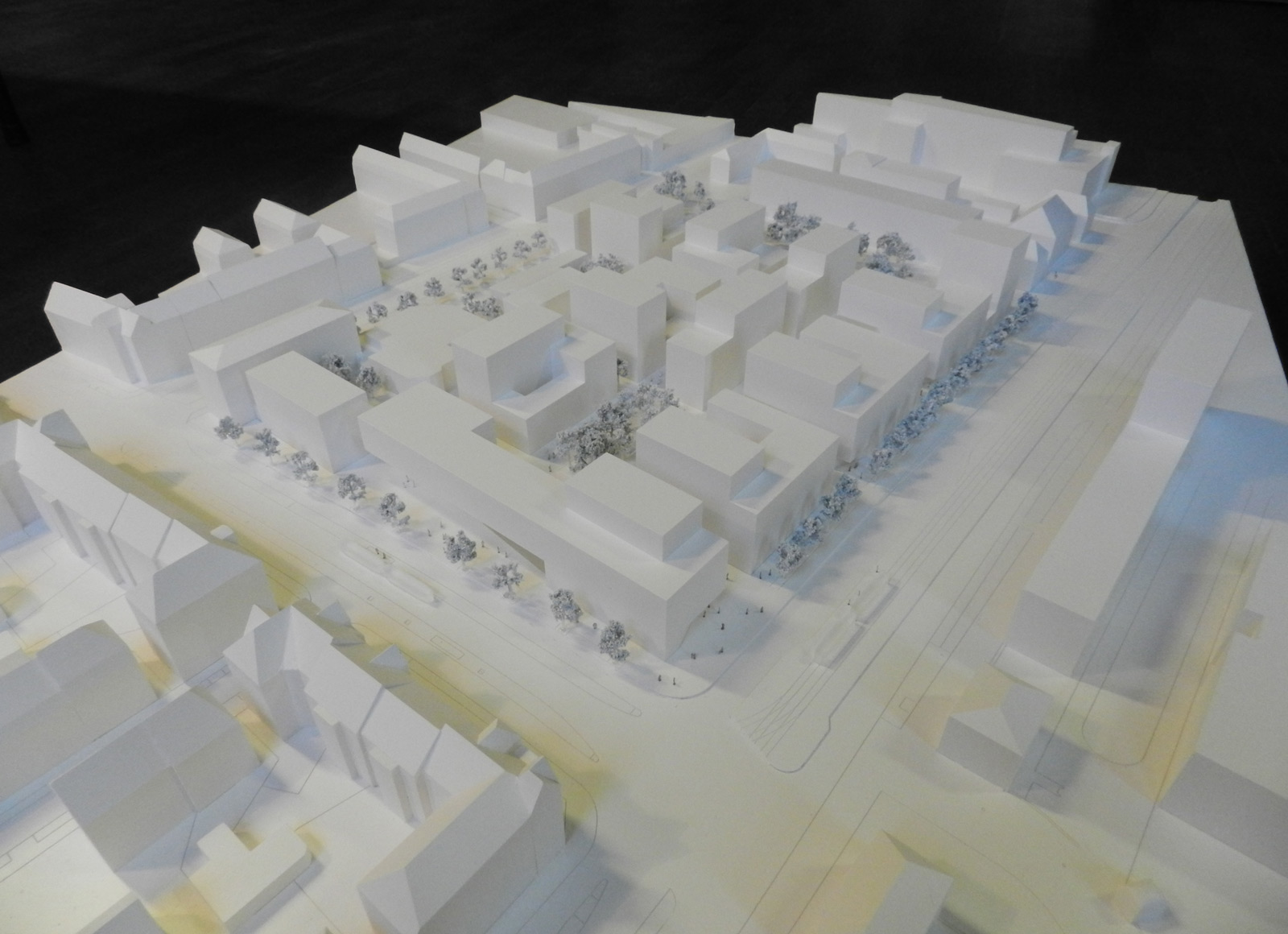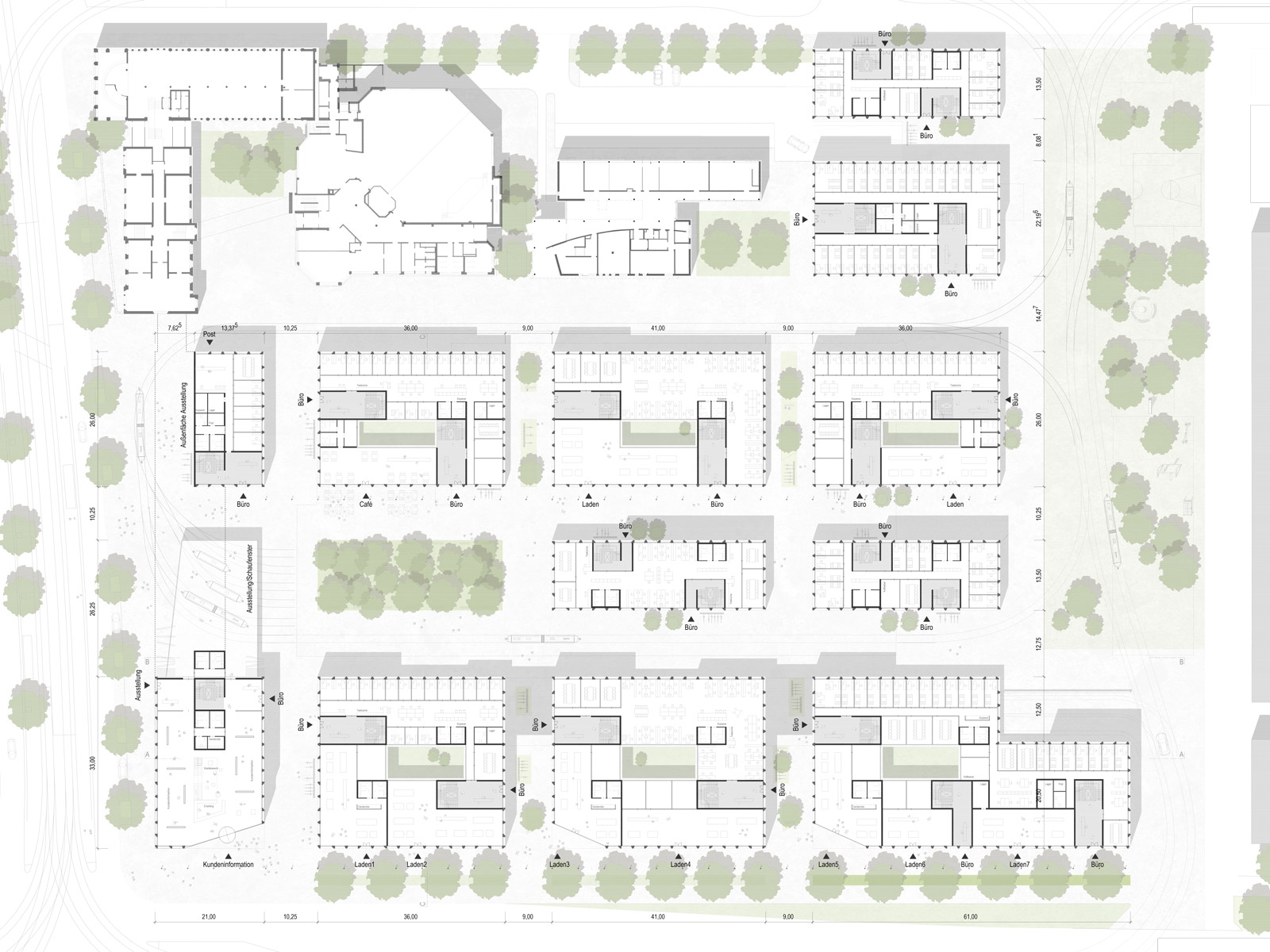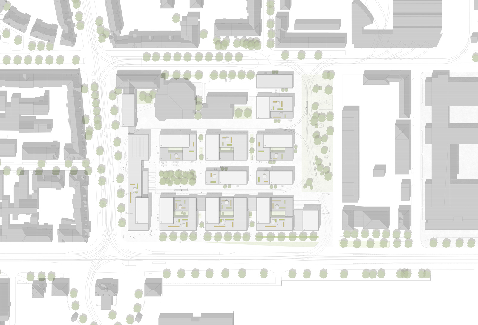 Die präzise Setzung der einzelnen Blöcke schafft ein robustes Grundgerüst für die weitere Bebauung des Areals und erlaubt zugleich die Integration bestehender Gebäude. Der zugrundeliegende Grid ermöglicht eine große Vielfalt an Gebäudetypologien bei einem hohen Maß an Homogenität und schafft dadurch eine quartierstypische, an die Gründerzeitstrukturen der Oststadt angelehnte Bebauungsdichte. Dabei übernimmt der strenge Raster die Aufgabe, als städtebauliches Kraftfeld die nötige Wirkung zu erzielen, während die Ausformulierung der einzelnen Bauten für die nötige Differenzierung sorgt, um in der präzisen Ordnung die spezifischen Stadträume unterscheidbar zu halten. Somit bleiben die einzelnen Adressen als städtebauliche Persönlichkeiten erinnerbar, ohne die zugrundeliegende Ordnung preiszugeben.