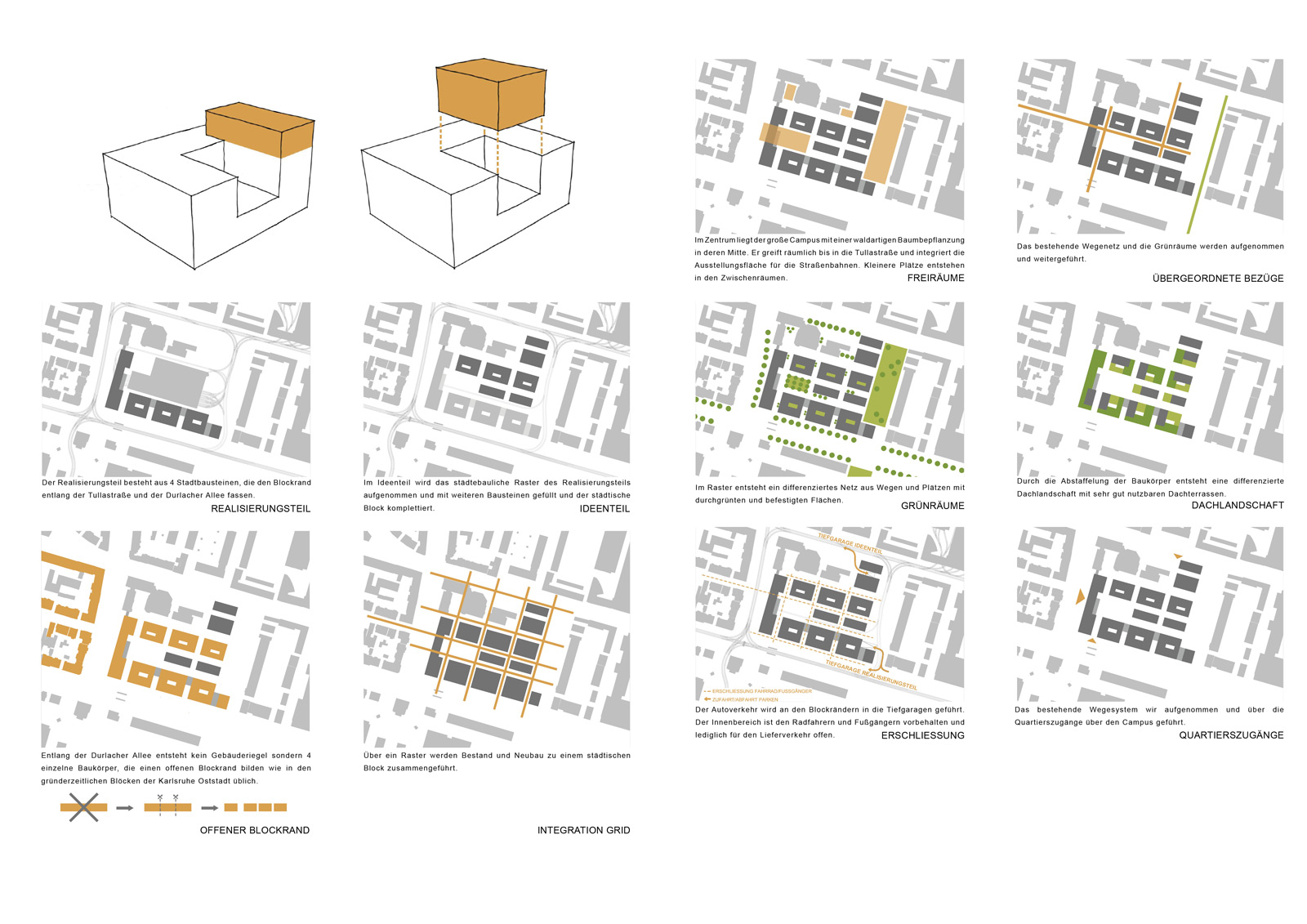 Die Neubebauung des Tramdepots an der Durlacher Allee orientiert sich am Leitbild des europäischen, verdichteten, innerstädtischen Geschäfts- und Wohnquartiers. Wichtigste Entscheidung der Arbeit ist, die Durlacher Allee nicht mit einem durchgehenden Bauwerk abzuriegeln, sondern durch die Ausformulierung einzelner Baufelder eine Verzahnung des Quartiers mit der Oststadt und dem Schlachthofareal zu ermöglichen.