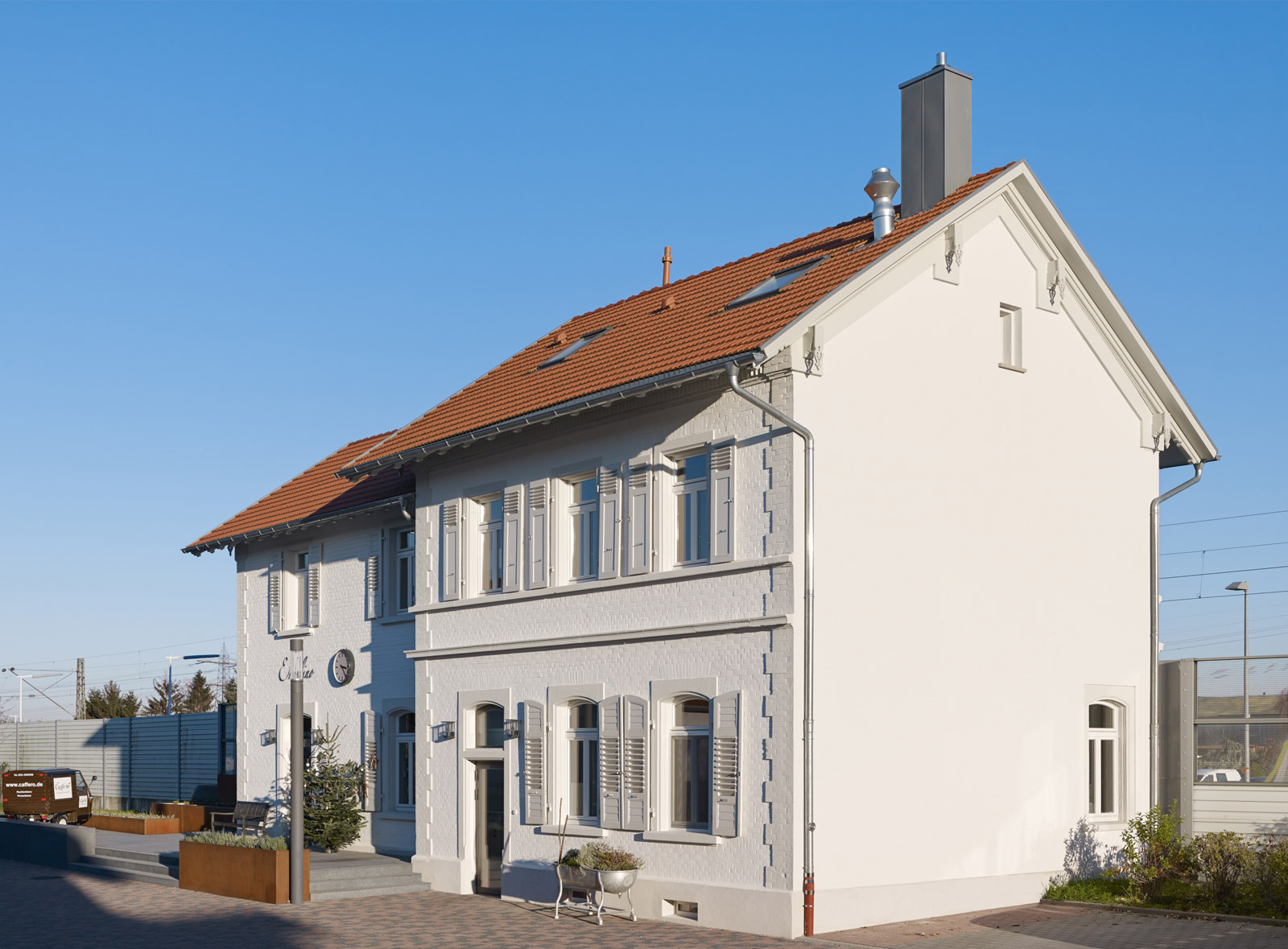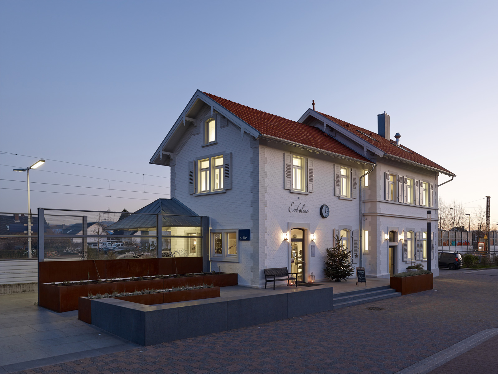 Das leerstehende Bahnhofsgebäude in Bietigheim (Baden) war zu sanieren und zu einem Bürgertreffpunkt mit Gastronomie und Vereinsräumen umzubauen. Um den Charakter des bescheidenen Landbahnhofs zu wahren, wurden notwendige Grundrissänderungen nur mit großer Zurückhaltung vorgenommen. Das schlichte Gebäude strahlt nach der Sanierung nun in frischem Weiß, um auch äußerlich die neue Bestimmung zu demonstrieren.
