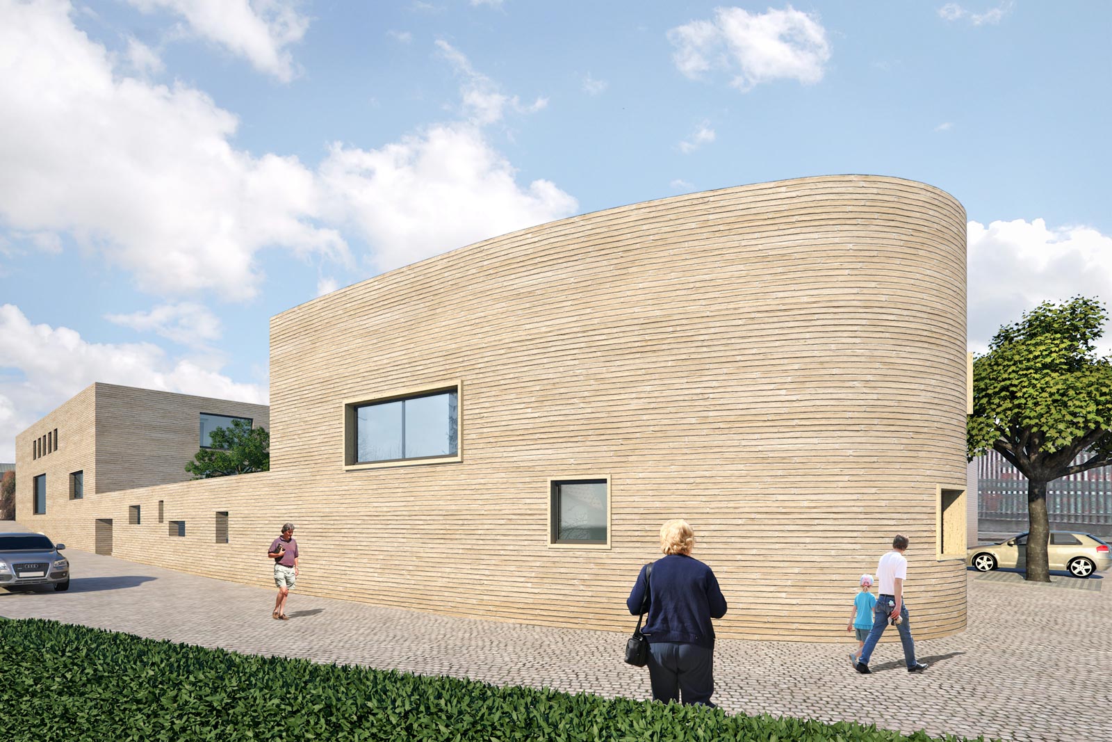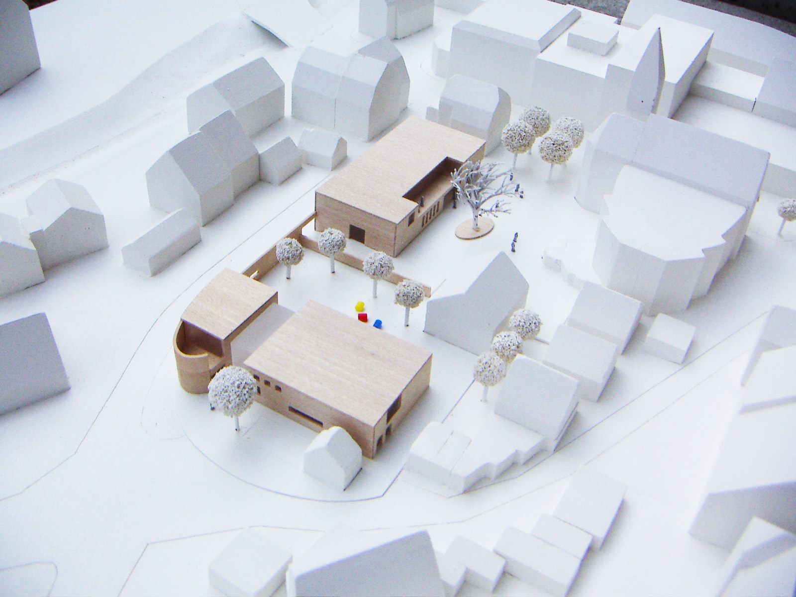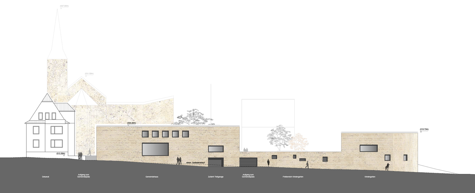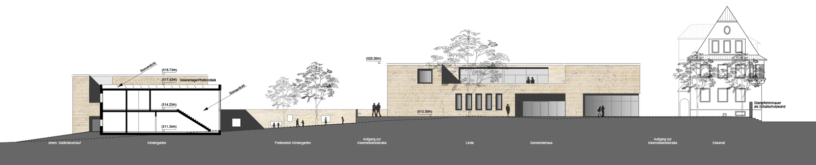 Der Kindergarten: Der Kindergarten wird ebenfalls durch die große Geste der alles umspannenden Mauer verortet. Er gliedert sich in einen steinernen öffentlichen Teil und einen Holzbaukörper, der die einzelnen Gruppenräume aufnimmt. Mit seinen Wegen und Plätzen, Gassen und Lufträumen ist der Bau für die Kinder ein charaktervolles Gehäuse im Sinne einer kleinen Stadt. Die nördliche Grundstücksspitze wird durch den „Bug“ der Mauer beschrieben; hier sind der Mehrzweckraum, die Kreativräume, die Küche sowie ein geschützter Freibereich untergebracht. Der nach Süden orientierte Spielbereich schafft die nötige Distanz zum Gemeindehaus.