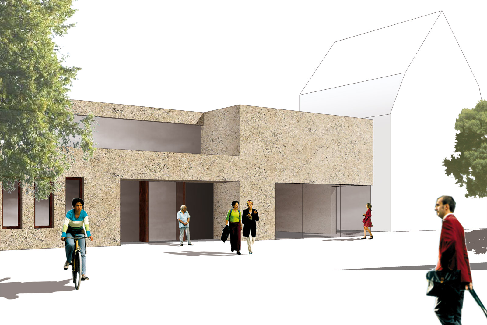 Das Gemeindehaus: Das Gemeindehaus öffnet sich mit Saal und Sitzungsräumen sowie seinem Foyer zum Gemeindeplatz; bei Festen kann die Saalfassade ganz geöffnet werden. Die Jugendräume befinden sich im Obergeschoss und sind separat von außen zugänglich, dadurch ist bei mehreren Veranstaltungen auch eine vollständige Aufteilung des Gebäudes möglich. Zusätzlich verfügen die Jugendräume über eine attraktive Freifläche im Obergeschoss.