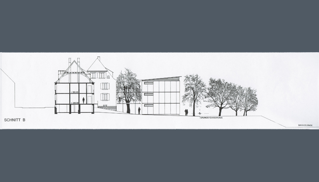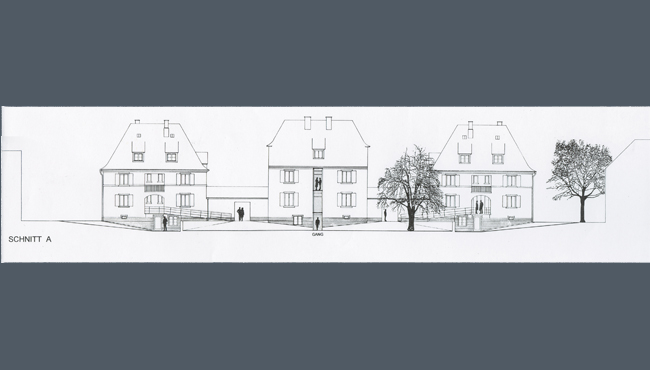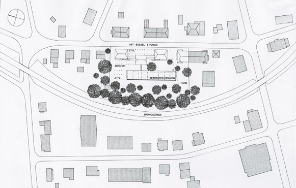 Zufahrt von Abt-Bessel-Straße zu hofseitigen Stellplätzen | Feuerwehr-Umfahrt auf Schotterrasen | Anbindung des Neubaus in jedem Geschoss über LaubengängeWohnungserschließung über einläufige Treppe/Lift und Laubengang | Gemeinschaftsbereiche im Altbau sowohl von Straßenseite als auch (behindertengerecht) von Gartenseite aus erschlossen | Behindertenfreundliche Geländemodellierung