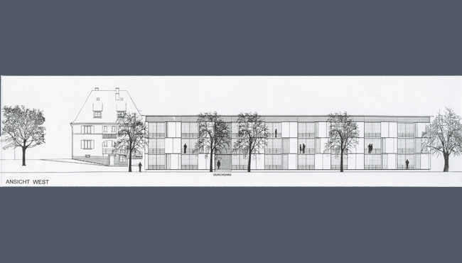 gedeckten Gang niveaugleich an den Altbau angeschossen (Treppen, Lift).Der bestehende Mittelbau wird zur Sozial- und Arztstation umgebaut; im Dach finden zwei (Schwestern-) Appartements Platz.