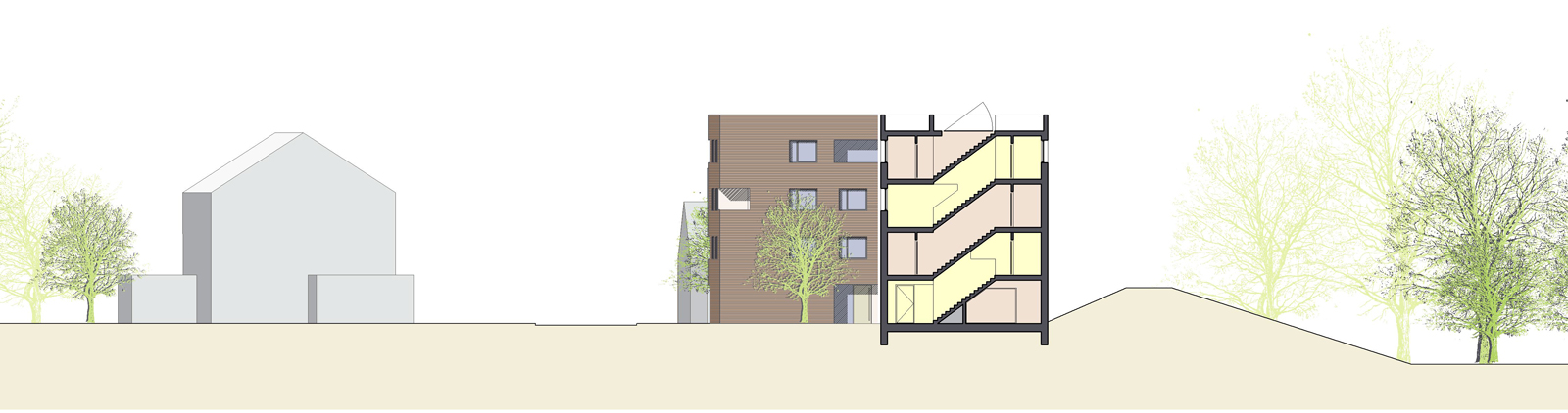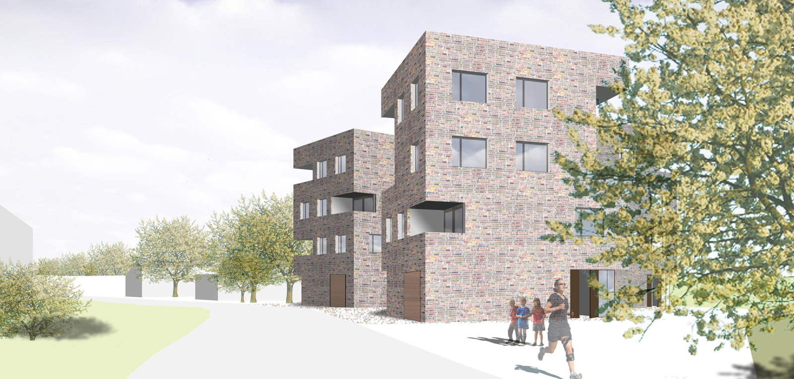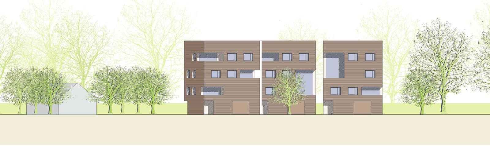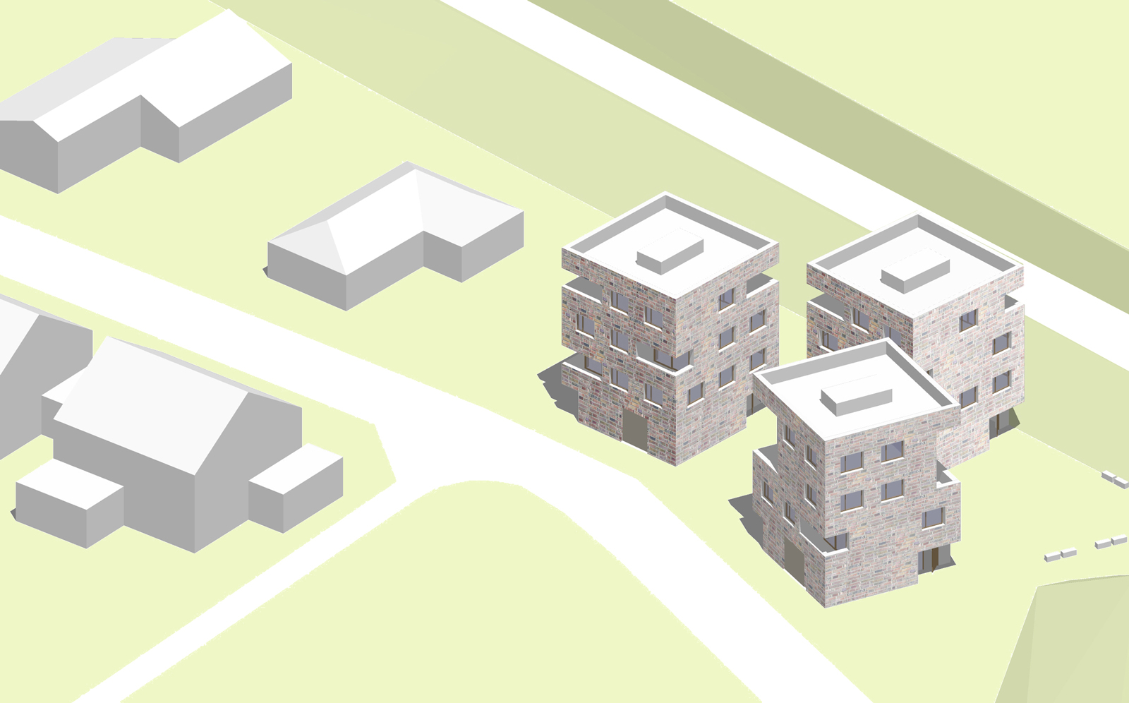 Umgebung: Das Grundstück fordert durch seine markante Lage am Ortseingang nach einem städtebaulichen Fingerzeig, der von zweieinhalbgeschossigen Gebäuden – wie unschwer auf der gegenüberliegenden Straßenseite zu erkennen ist – nicht zu leisten ist. Daher haben wir uns entschieden, einen turmartigen Haustyp mit drei Wohngeschossen und einem Sockelgeschoss zu entwerfen. Die Gebäudegruppe aus drei gleich großen, quadratischen Türmen gibt der ausufernden, niedrigen Einfamilienhausbebauung entlang des Damms den nötigen Halt.