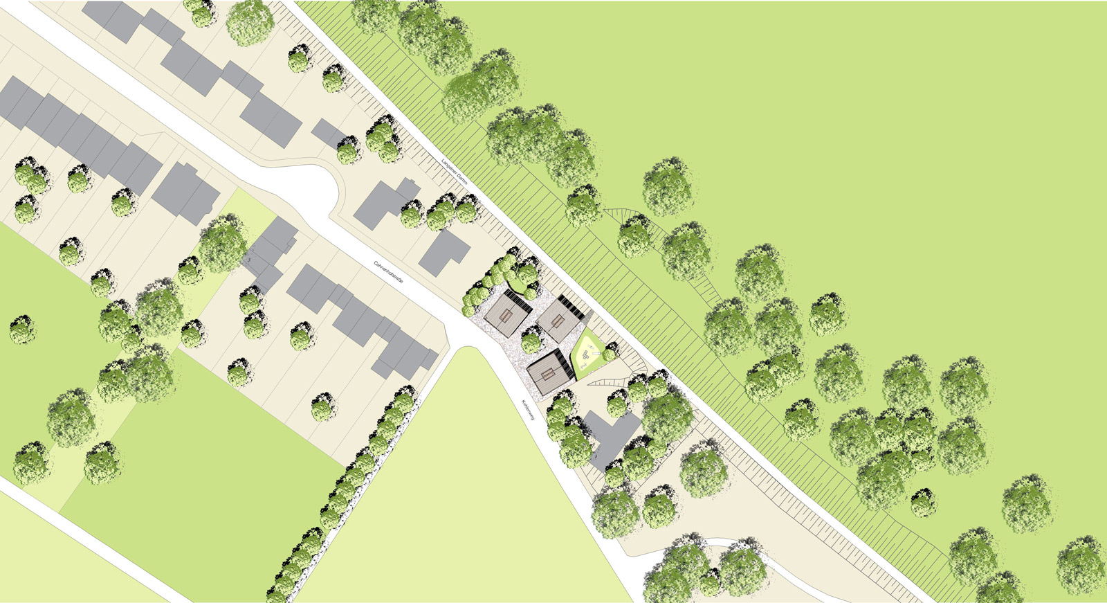 „Wohnen am Strom“ heißt in Langel zunächst Wohnen in einem dörflich-idyllischen Kontext, geprägt durch eine ländliche Struktur, unmittelbar vor den Toren der Großstadt. Dennoch zielt unser Ansatz auf eine eher städtische Wohnform, das turmartig verdichtete Doppelhaus. Das hat mehrere Gründe.