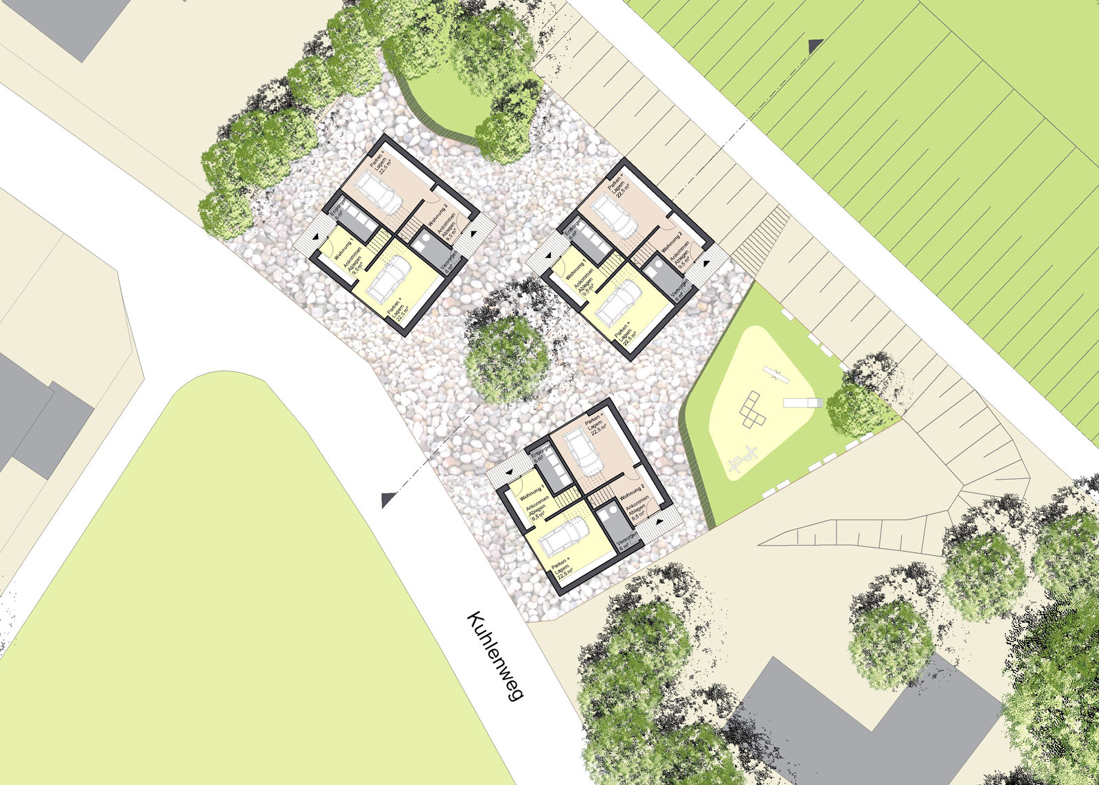 Wohnen: Die drei Gebäude variieren bei gleicher Erschliessung, dadurch werden unterschiedliche Grundrisse erzielt. Es ist unschwer zu erkennen, wie die hier gleichgross dargestellten Zwillingswohnungen durch Schalträume in verschieden grosse Wohnungen umgenutzt werden könnten. Allen Wohneinheiten sind Blicke in mindestens drei Himmelsrichtungen und gut abgeschirmte Freiräume gemein.