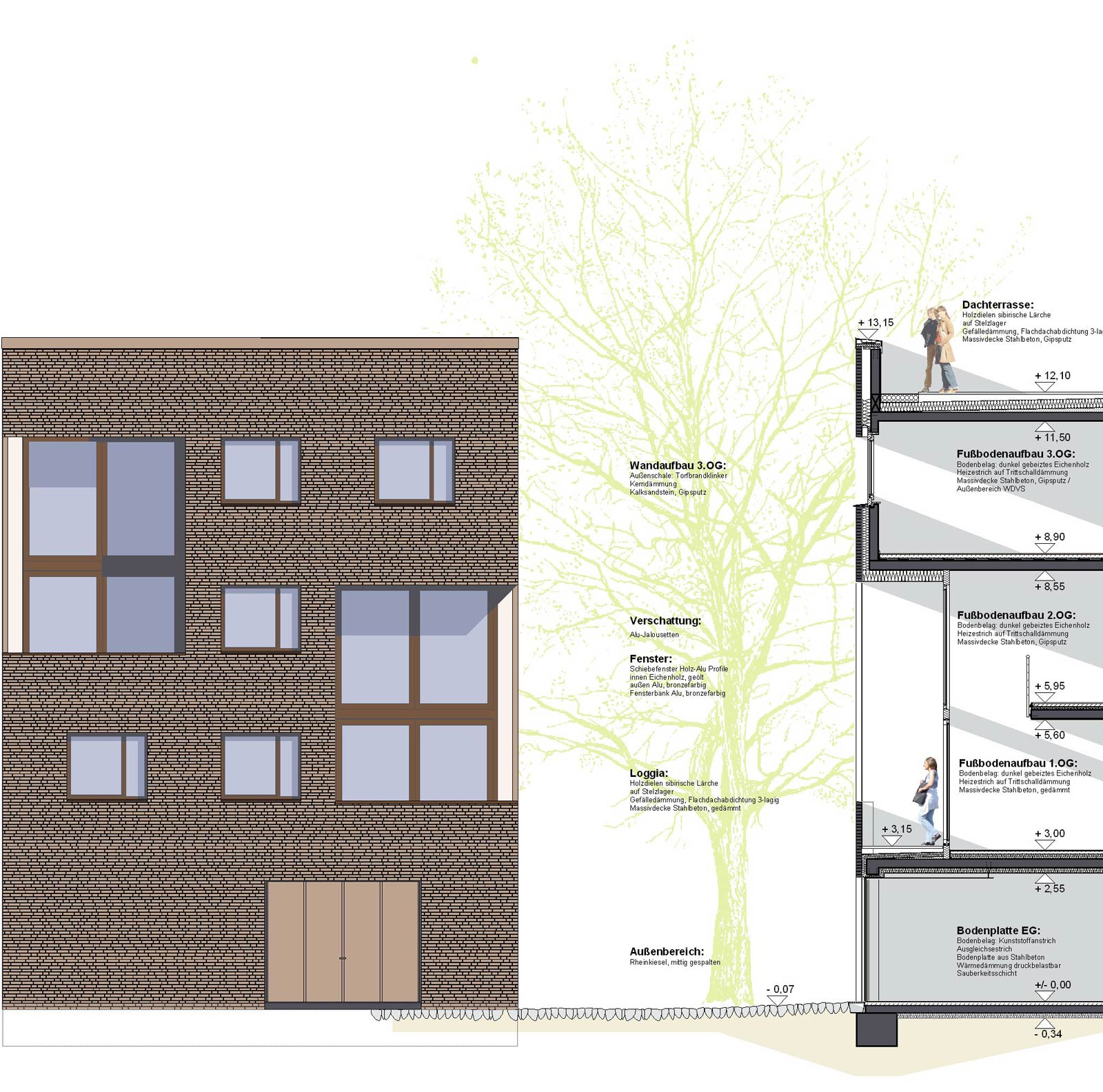 Material: Ortstypisch für die rheinischen Dörfer ist der Backstein, häufig in Feld- oder Torfbrand. Die drei Wohntürme werden mit einer Vorsatzschale aus handgestrichenen Torfbrandziegeln versehen. Daß es sich nur um eine Schale handelt (im Gegensatz zu den massiv gemauerten Wänden der alten Dorfgebäude), wird an den Loggien deutlich, deren innere Haut weiß verputzt in Erscheinung tritt. Fenster aus Eichenholz, versehen mit einer Wetterschale aus Baubronze, und Kupferblechabdeckungen der Attiken und Fenstersimse vervollständigen das einheitliche, ruhige Bild.