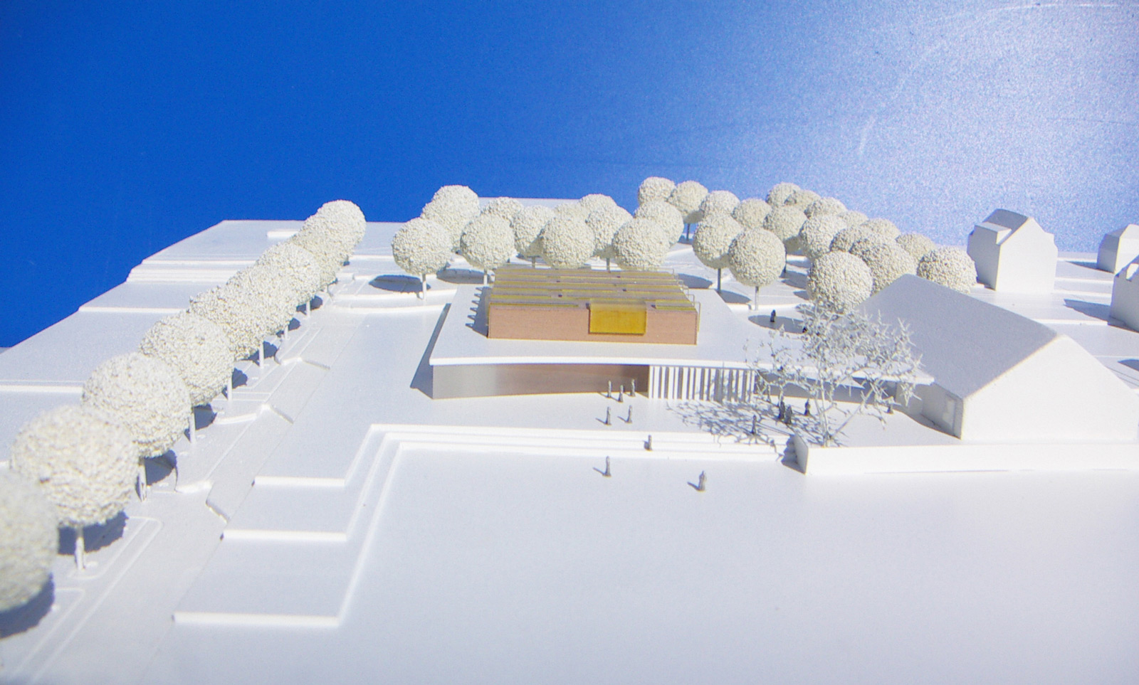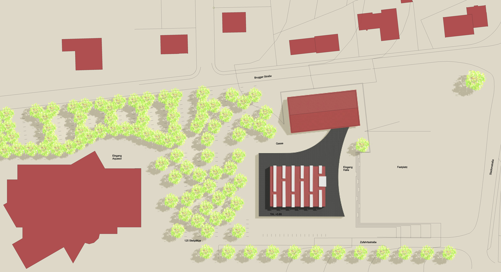 Der Vorbereich der Hallen bietet sowohl Aus- und Überblick auf den Festplatz als auch Blickbezüge zur Stadt und zur Alb. Beide Hallen bilden eine teilweise überdeckte Gasse und leiten als Torsituation vom Festplatz über zum Parkplatz und zum Aquasol. Das Aquasol wird so von seinem Hinterhofdasein befreit und Teil einer natürlichen Abfolge von Freiflächen, Gebäuden und Wegbeziehungen.