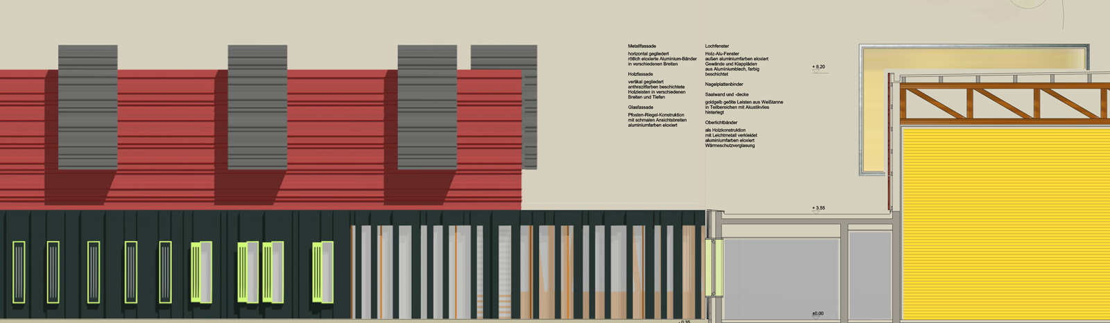 Auf dem massiven Sockel erhebt sich zurückgesetzt der Baukörper des Festsaales. Dieser ist von einer horizontal gegliederten Metallfassade umgeben. Die rötlich eloxierten Aluminiumbänder in verschiedenen Breiten geben dem Gebäude eine farbige und spielerische Ausstrahlung.Die Belichtung des Saales erfolgt durch Seiten- und Oberlichtbänder, die die ruhigen Oberflächen von Saalwand und Decke durchdringen und gliedern. Nach Außen treten diese Belichtungselemente als balkenförmige Körper hervor, abends und nachts durch die Hallenbeleuchtung als Landmarke zum Strahlen gebracht.