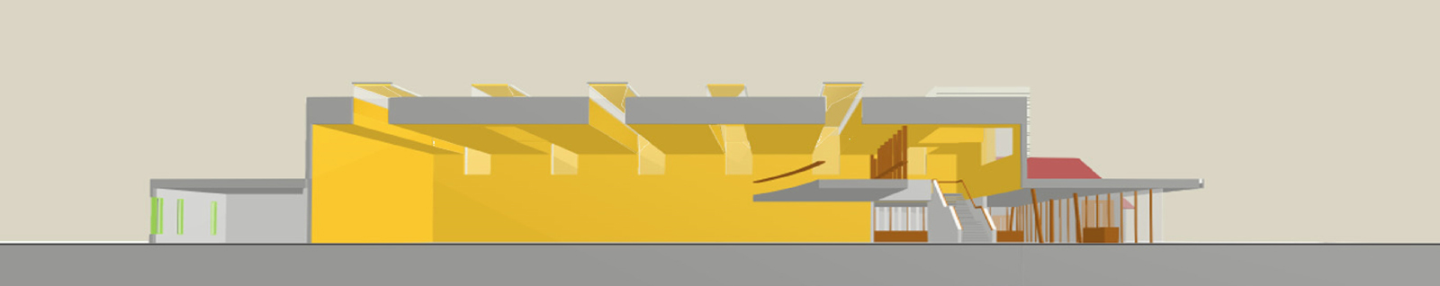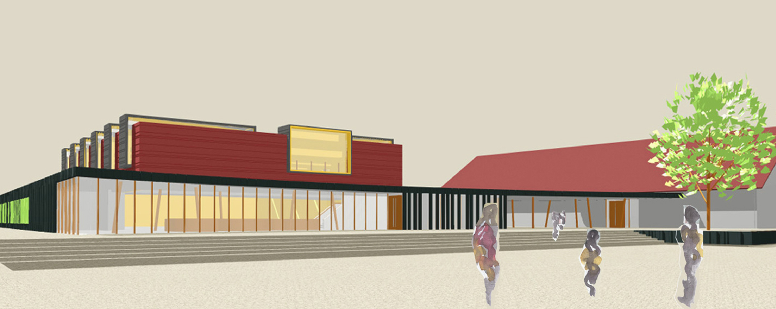 Ein flaches Sockelgebäude mit ausschweifender Attika besetzt die Fläche oberhalb des Festplatzes von Rottweil. Eine vertikal gegliederte, anthrazitfarbene Holzfassade umhüllt den Baukörper, großflächige Verglasungen im Foyer- Bereich und rhythmisch gesetzte schmale Lochfenster belichten die Räume.
