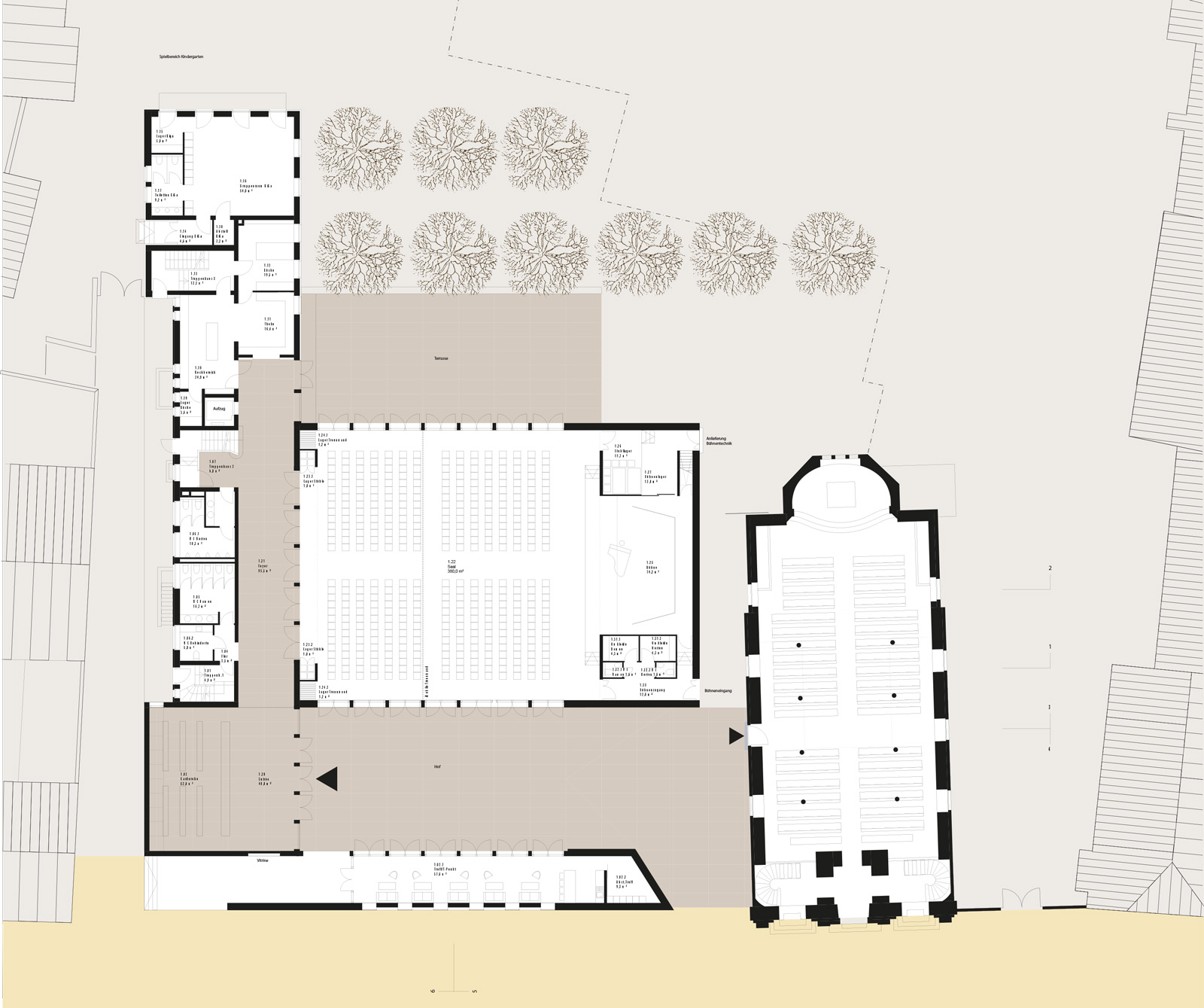 Es ergibt sich eine Folge von zwei längsrechteckigen Platzräumen, getrennt durch einen pavillonartigen, janusköpfigen Baukörper - eine Referenz an die reiche Baugeschichte der Stadt -, der die historische Situation des mittels einer Mauer zur Straße hin abgeschlossenen Pfarrgartens wieder aufgreift. Das Gemeindezentrum erhält eine Adresse an der Straße, ohne selbst unmittelbar an die Straße zu rücken. Der gemeinsame Hof stellt das Zentrum der Anlage das und verbindet die unterschiedlichsten Funktionen wie Kirche, Saal, Foyer, Gemeinderäume und Treff, ohne sie in ein starres bauliches Korsett zu zwängen.