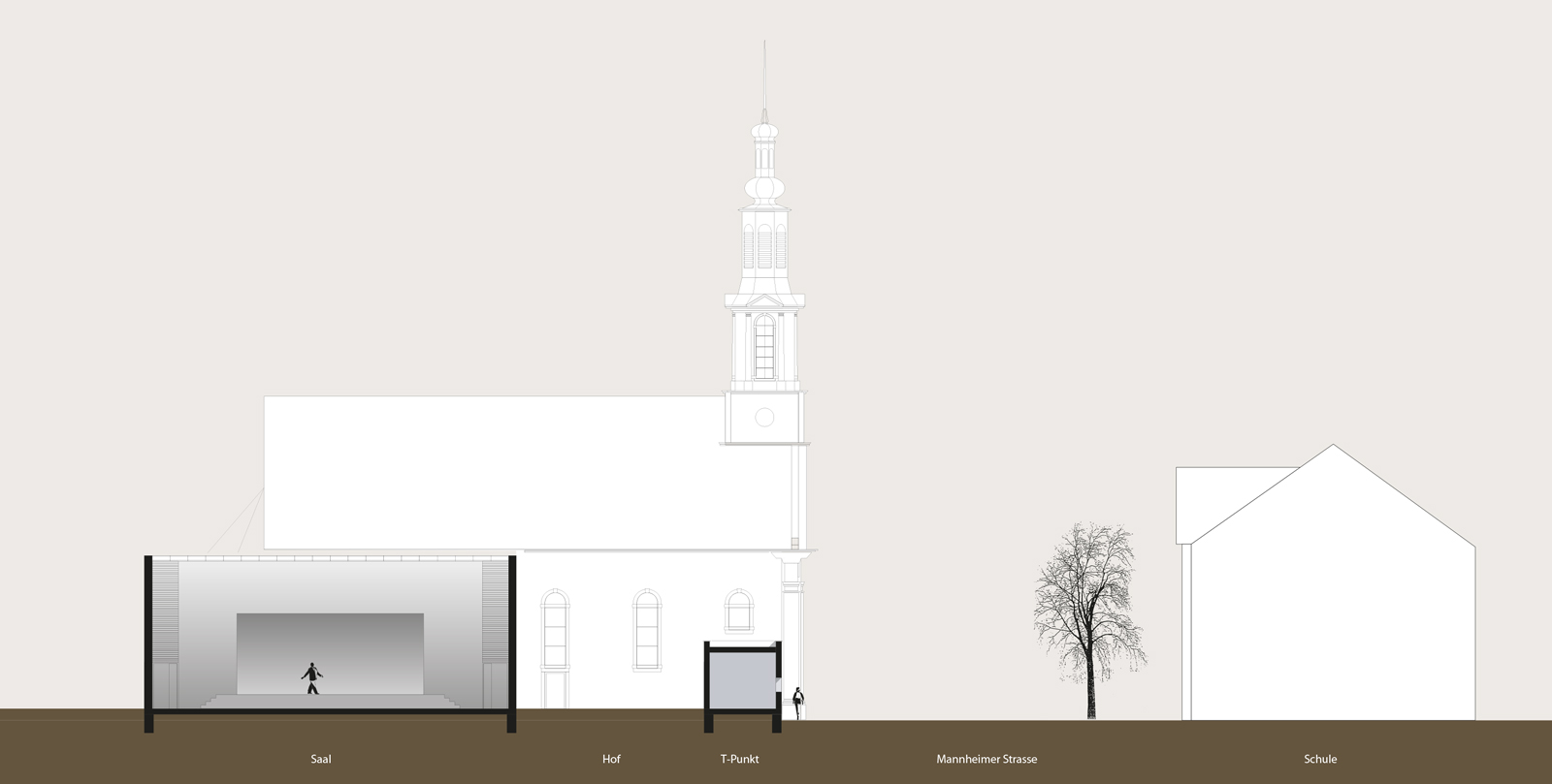 Die platzartige Aufweitung der Mannheimer Straße weist neben der Stadtkirche mit dem spätklassizistischen Schulhaus ein weiteres städtebauliches wichtiges Gebäude auf, das in seiner Noblesse dem Straßenraum sein unverwechselbares Gepräge gibt. Die klare, beherrschende Stellung diese Baus zu respektieren, war ein wesentlicher Ansatzpunkt bei der Lösungsfindung.