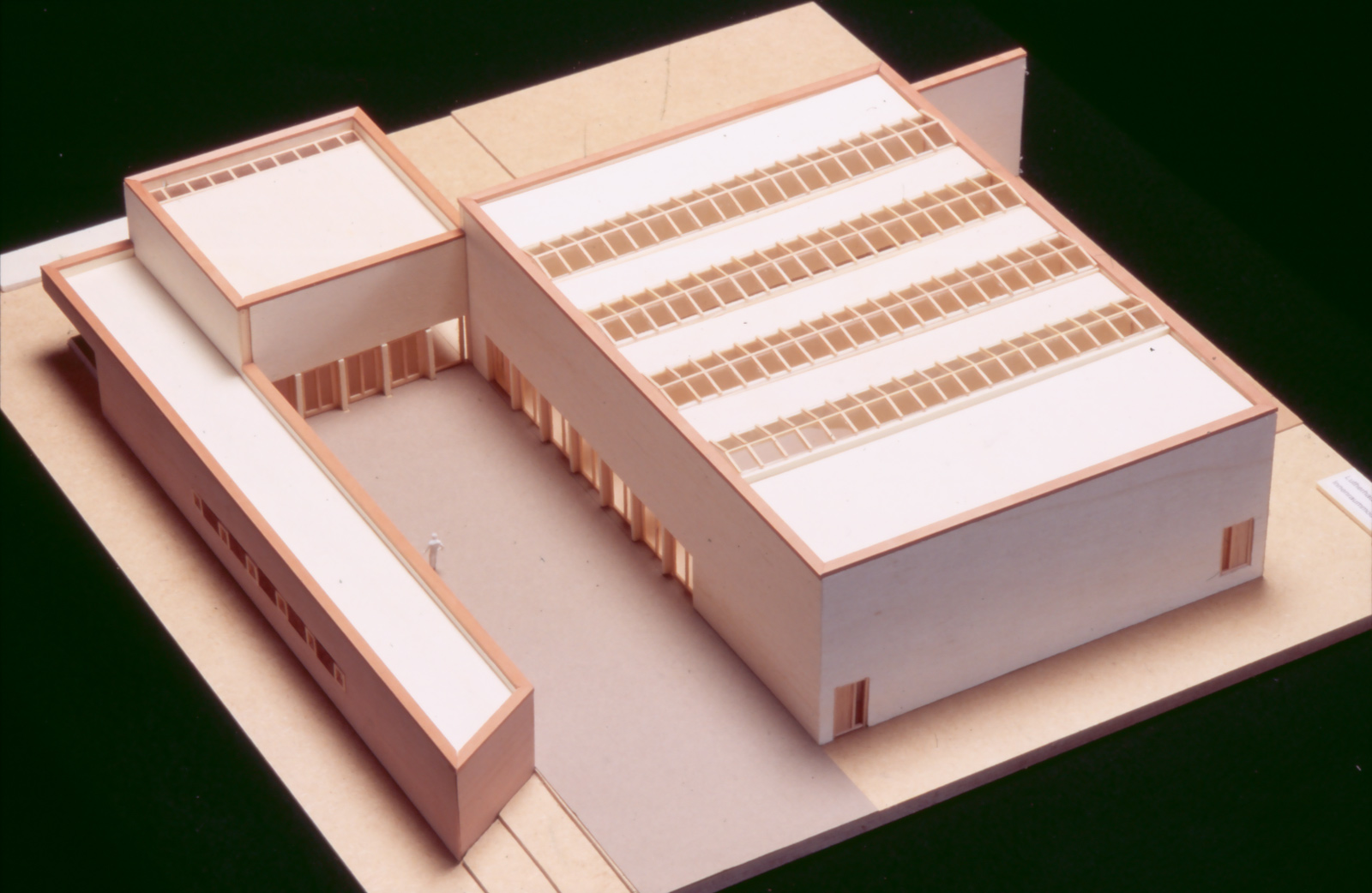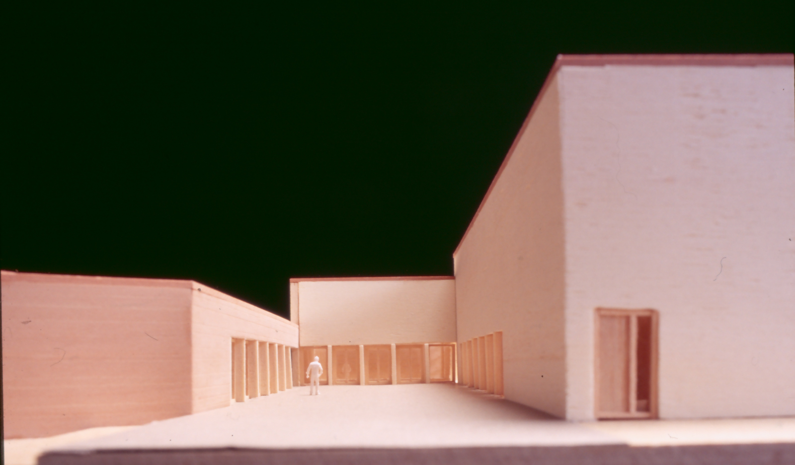 In Anwendung auf die vorliegende Aufgabe heißt das, den Straßenraum an seinen ursprünglichen Raumkanten wieder zu fassen, ohne das Gemeindezentrum in Konkurrenz zum Schulbau treten zu lassen. Daher haben wir uns entschlossen, den Raum durch einen vier Meter hohen Längsriegel so zu gliedern, daß ein öffentlicher Platz und ein intimer Hof entstehen. Dieser Hof wird von der ruhigen Front des Saalbaus begrenzt der durch seine Lage in zweiter Reihe den Alleinstellungsanspruch der Alten Schule noch infrage stellt, jedoch infolge der Höhenstaffelung trotzdem im Straßenraum präsent ist. Zugleich behält die Schaufassade der Kirche ihre Wirkung.