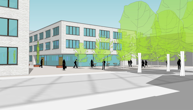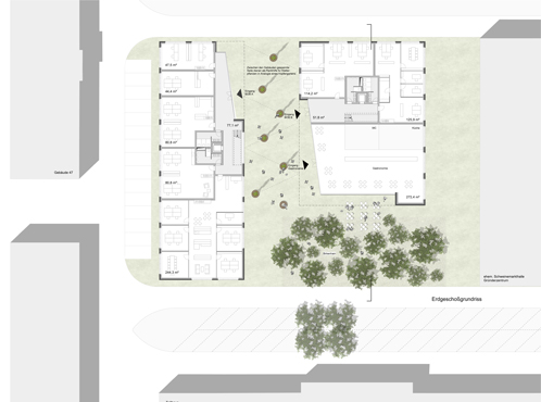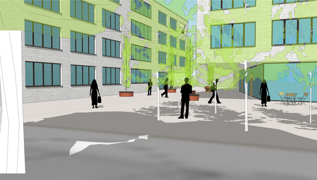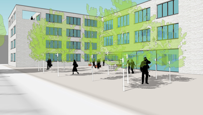 Unweit der wichtigsten Forschungseinrichtungen der ersten deutschen Excellenz-Universität, des Karlsruhe Institute of Technology (KIT) gelegen, soll das energetisch ausbalancierte Bürogebäude neue Standards auch in der Gestaltung aufzeigen. Sein Konzept variiert die bewährte BOB-Struktur, setzt aber zugleich auf ein eigenständiges Erscheinungsbild. Die mäanderförmige Bandfassade steht für die angestrebte Individualität der einzelnen Geschoss-Grundrisse bei gleichzeitiger Einfügung in ein übergeordnetes bauliches und energetisches Gesamtkonzept.
