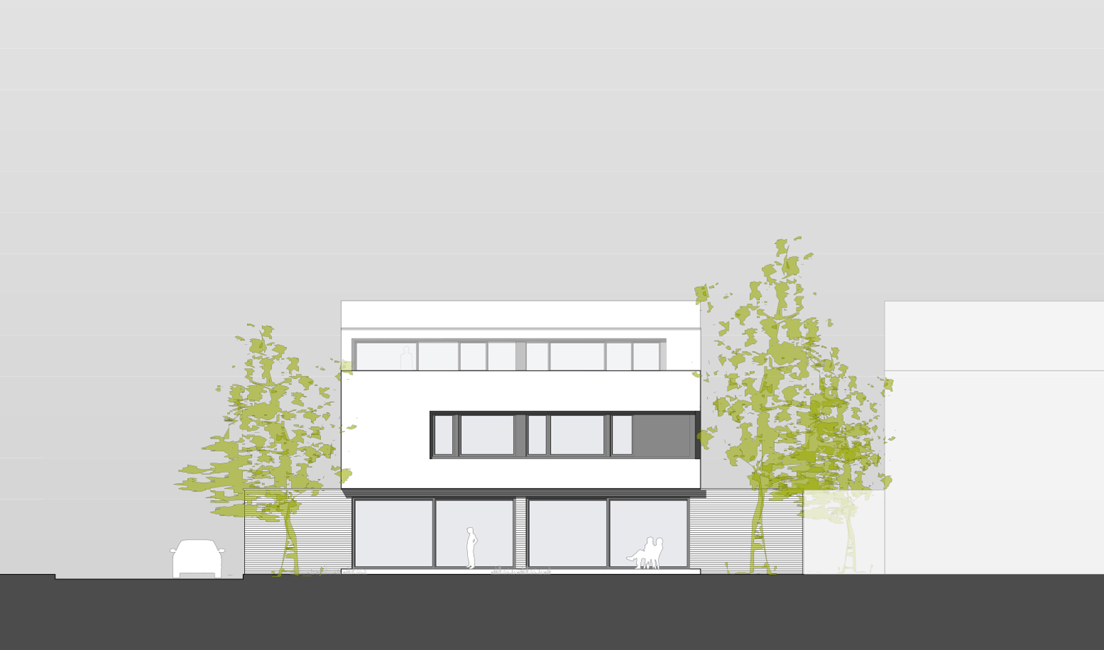 Eine breit gelagerte Holzkiste, auf der ein großer Putzbaukörper zu balancieren scheint, mit Fassaden, die einem Steckspiel entlehnt scheinen - ein großes Haus, nicht zwei kleine, ruhig, selbstbewusst, anders. Darin zwei Wohnungen, die einander nicht gleichen, sondern die das Spiel von Ausrichtung und Ausblick, Orientierung, Erschließung, Sonneneinfall und Himmelsrichtung spielen, die sich geschossweise um die Treppe drehen und die damit "Wohnen" in seiner ganzen Bandbreite ermöglichen. Mehrdeutig statt eindeutig, Vielfalt statt Einfalt, knapp, kompromisslos, klar - Wohnen für Menschen, die mehr wollen als zwei gleiche Hälften.