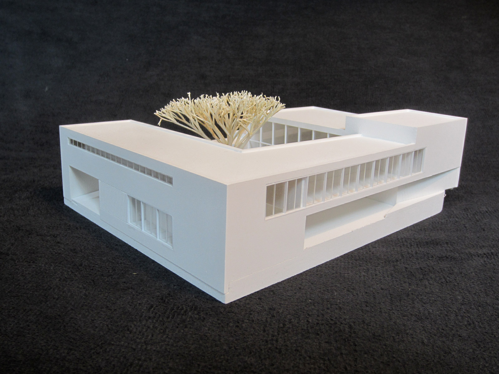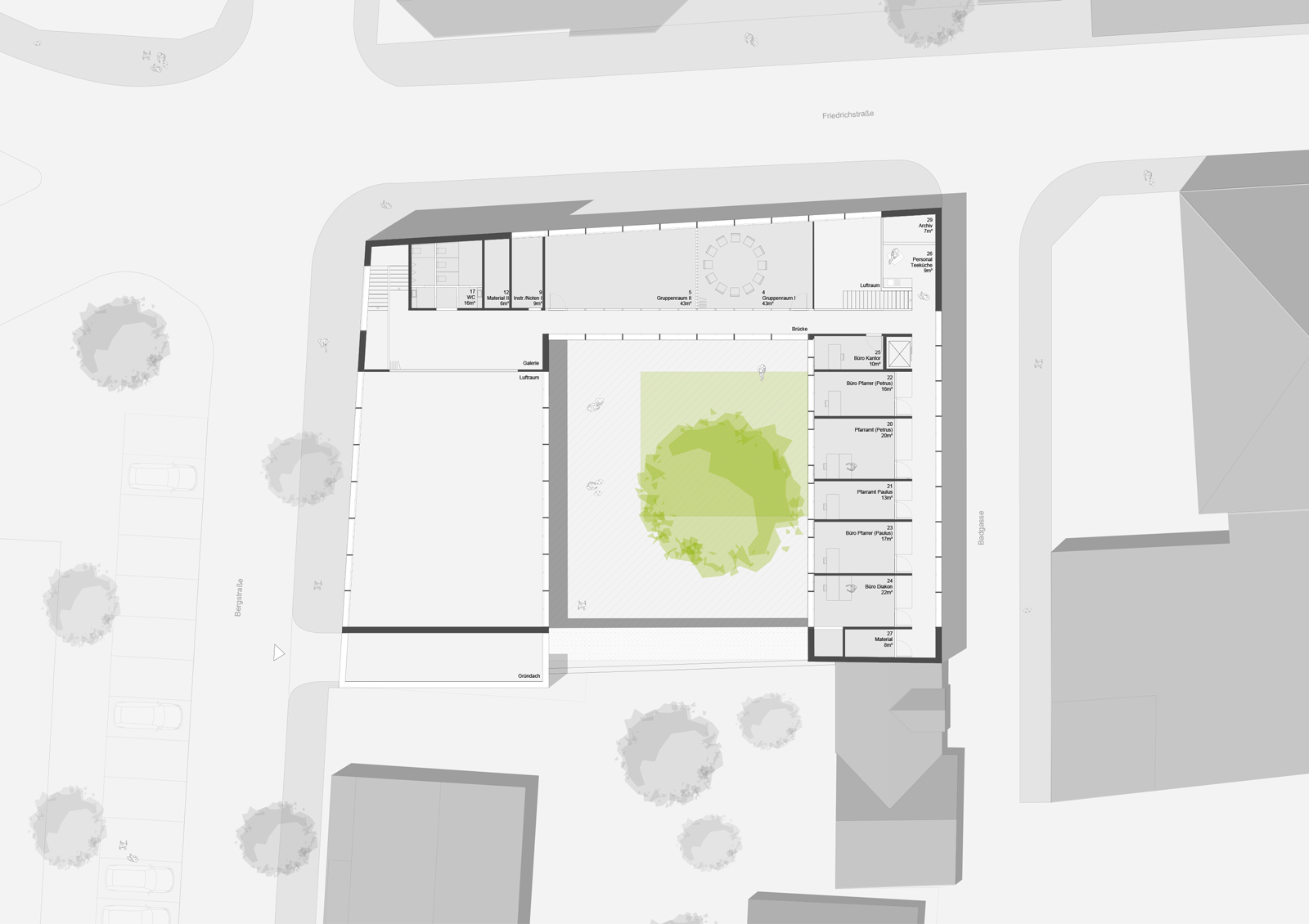 Der große Gemeindesaal: nicht das Zentrum des Ensembles, sondern ein Teil desselben, mit Empore und vielfältigen Möglichkeiten der Nutzung. Der Verwaltungstrakt- ein offenes, ein freundliches Haus, auf der Hofebene der Werkraum und der Jugendbereich, separat erschließbar, darüber eine Gemeindeleitung. Dazwischen, als Brückenschlag, die Gemeinderäume für kleinere Veranstaltungen.