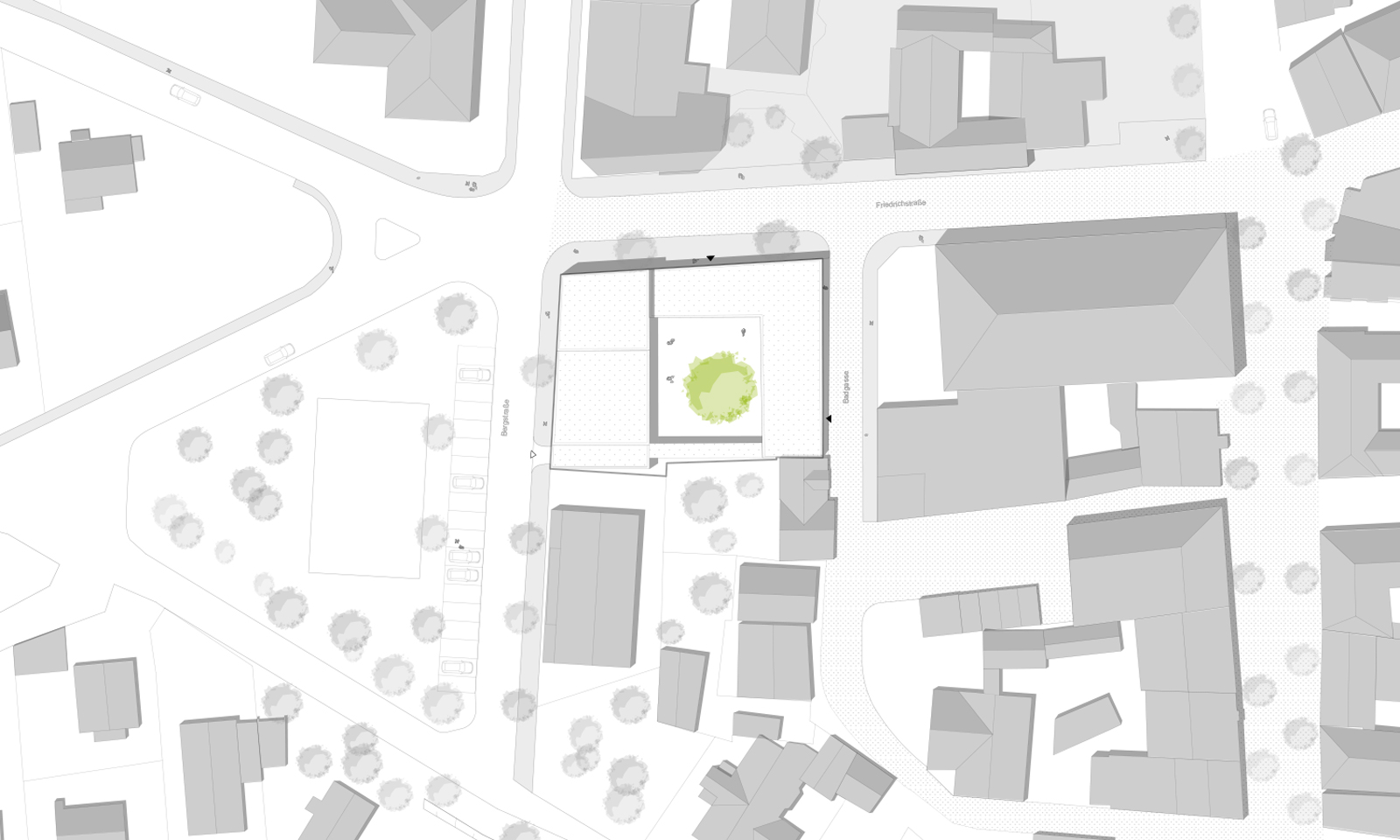Unser Entwurf versucht, diese und weitere Themen in einem Baukörper größtmöglicher Homogenität zu vereinen: ein Blockrand als Hofanlage, ein Baukörper, aber drei Flügel, organisiert wie eine kleine Stadt, in der Mitte der gemeinsame Hof, der zugleich eine öffentliche Durchwegung bietet. Eine strenge Form nach außen, eine weiche Fassade nach innen, alles verbindend der Kastanienbaum im Zentrum der Anlage.