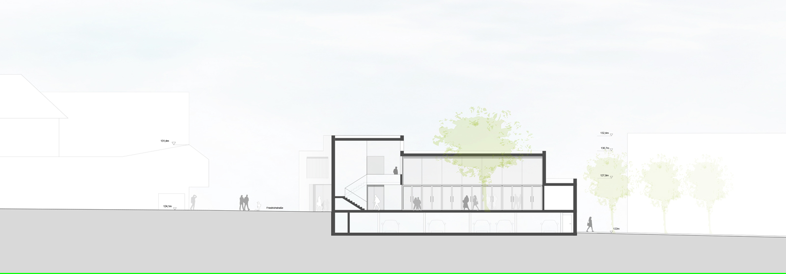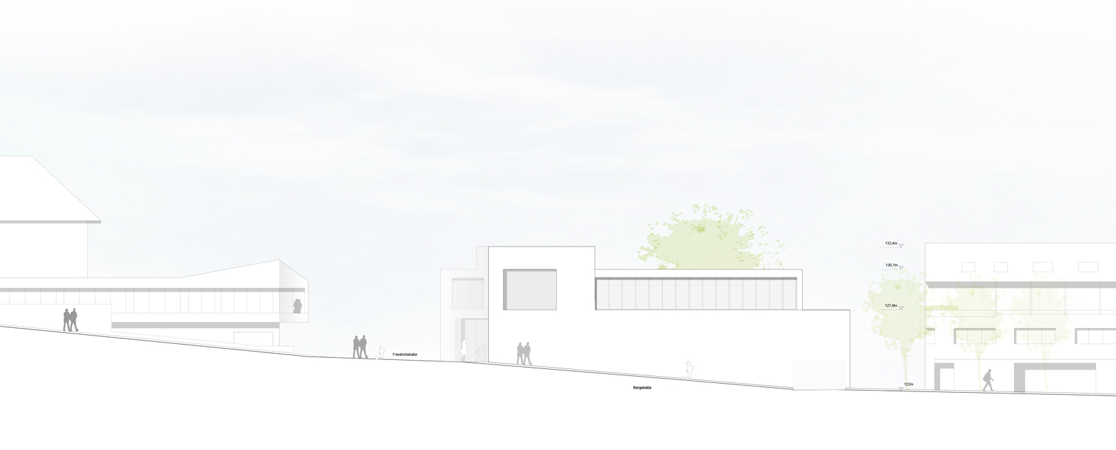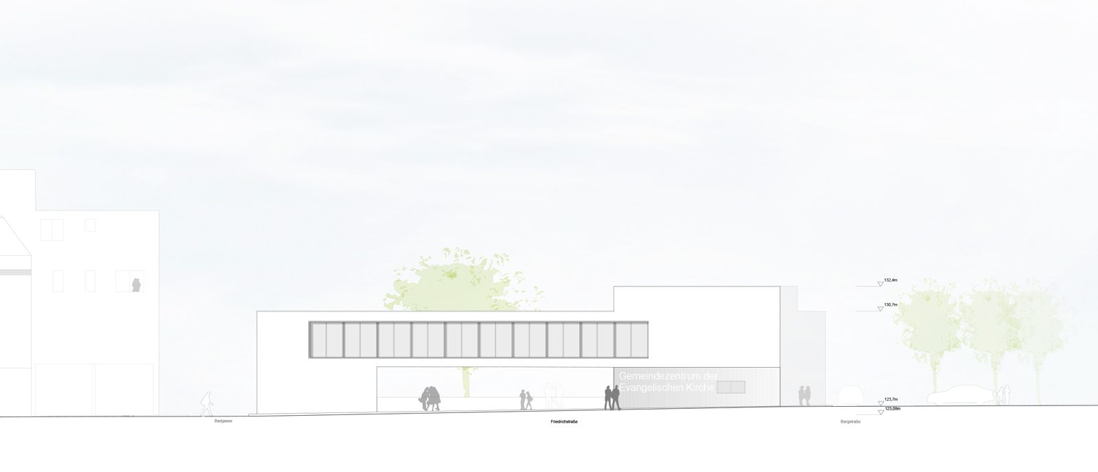 Ein Gemeindezentrum als klares Bekenntnis zur Stadt und ihren Bürgern ist neben Kirche und Rathaus, Schule und Kulturhaus ein wichtiger, ein öffentlicher Baustein. Dem soll die Gestaltung und Materialwahl Rechnung tragen- Nachhaltigkeit im Wortsinne, Dauerhaftigkeit, Ernst ohne Pathos. Der Hof lädt ein und vermittelt zur Stadt, die Fassaden bilden ab, was hinter ihnen geschieht- so wünschen wir uns den baulichen Ausdruck von Gemeinde, Identität, Gemeinschaft.