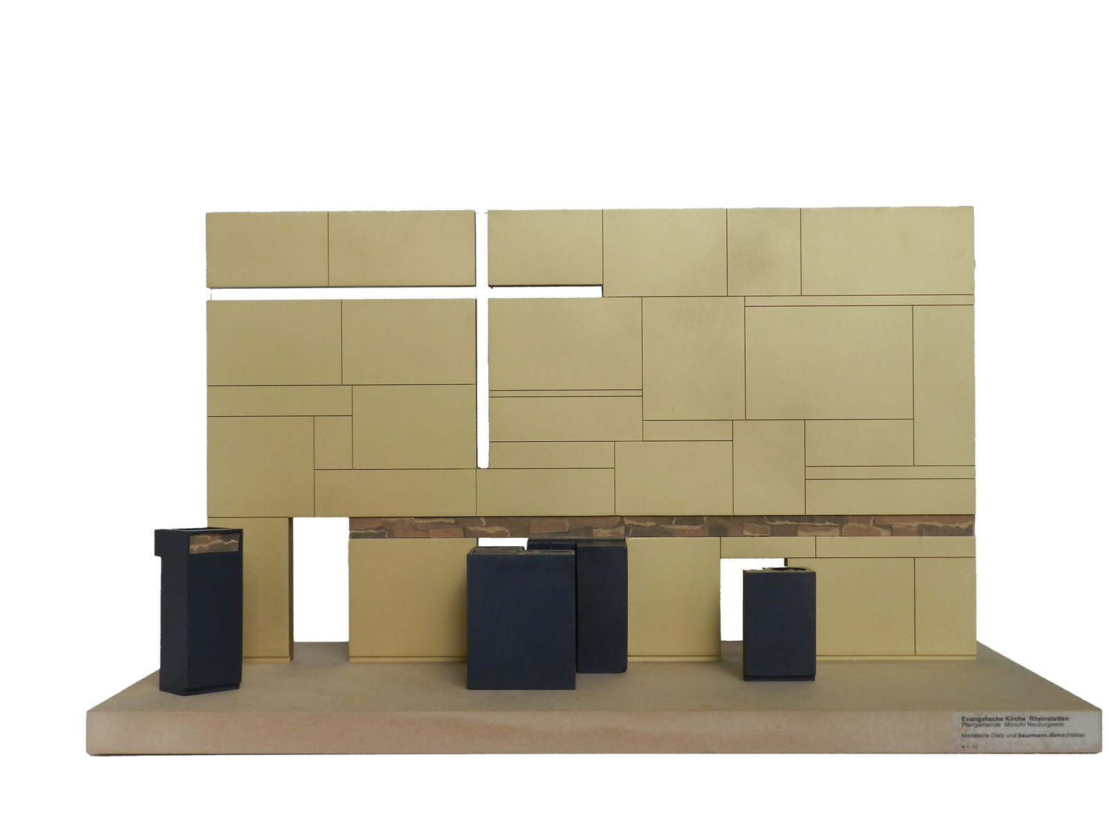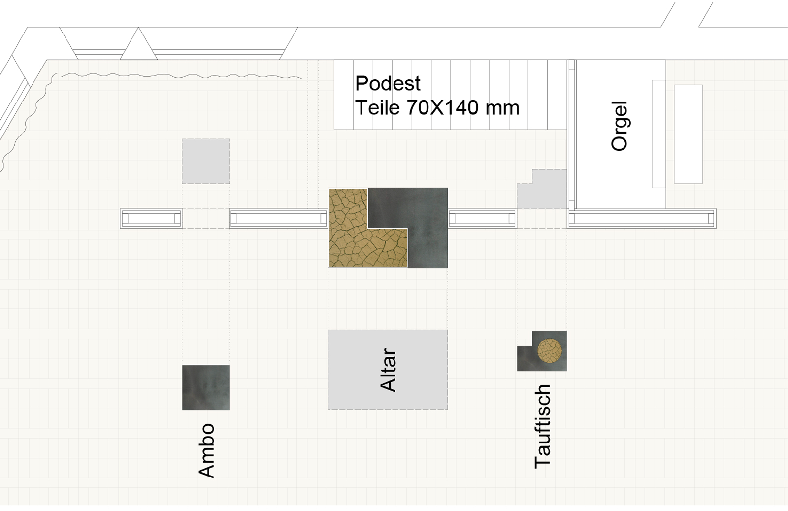 Lage und Dimension sind wichtiger als ihre Materialität- vorstellbar ist eine Oberfläche aus dunklem Stahlblech, auch ein messingfarbenes Aluminium können wir uns denken. Altar, Ambo und Taufbecken verschwinden in ihr und bleiben dennoch präsent im Raum, sie nimmt die Orgel auf und Stühle, Podeste oder das Klavier. Ihr einziger Schmuck ist das Kreuz, dessen Linien ein Fugengeflecht ausbilden, in das die Prinzipalien sich bei Nichtgebrauch beinahe nahtlos einfügen.