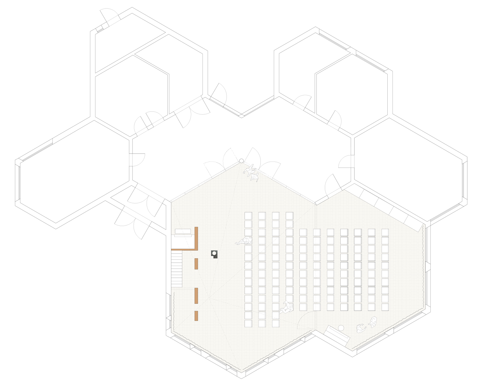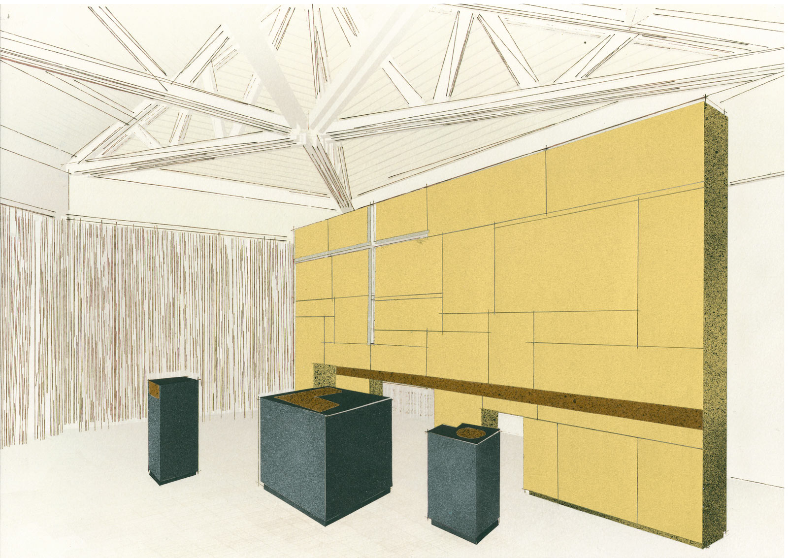 Leitgedanke für die Intervention ist eine eingestellte Wandscheibe, die Folie der Aktion im Raum, Träger der Prinzipalien und Stauraum zugleich sein soll. Durch die präzise Setzung der Wand bekommt der Raum die Ausrichtung, die ihm bislang fehlt.