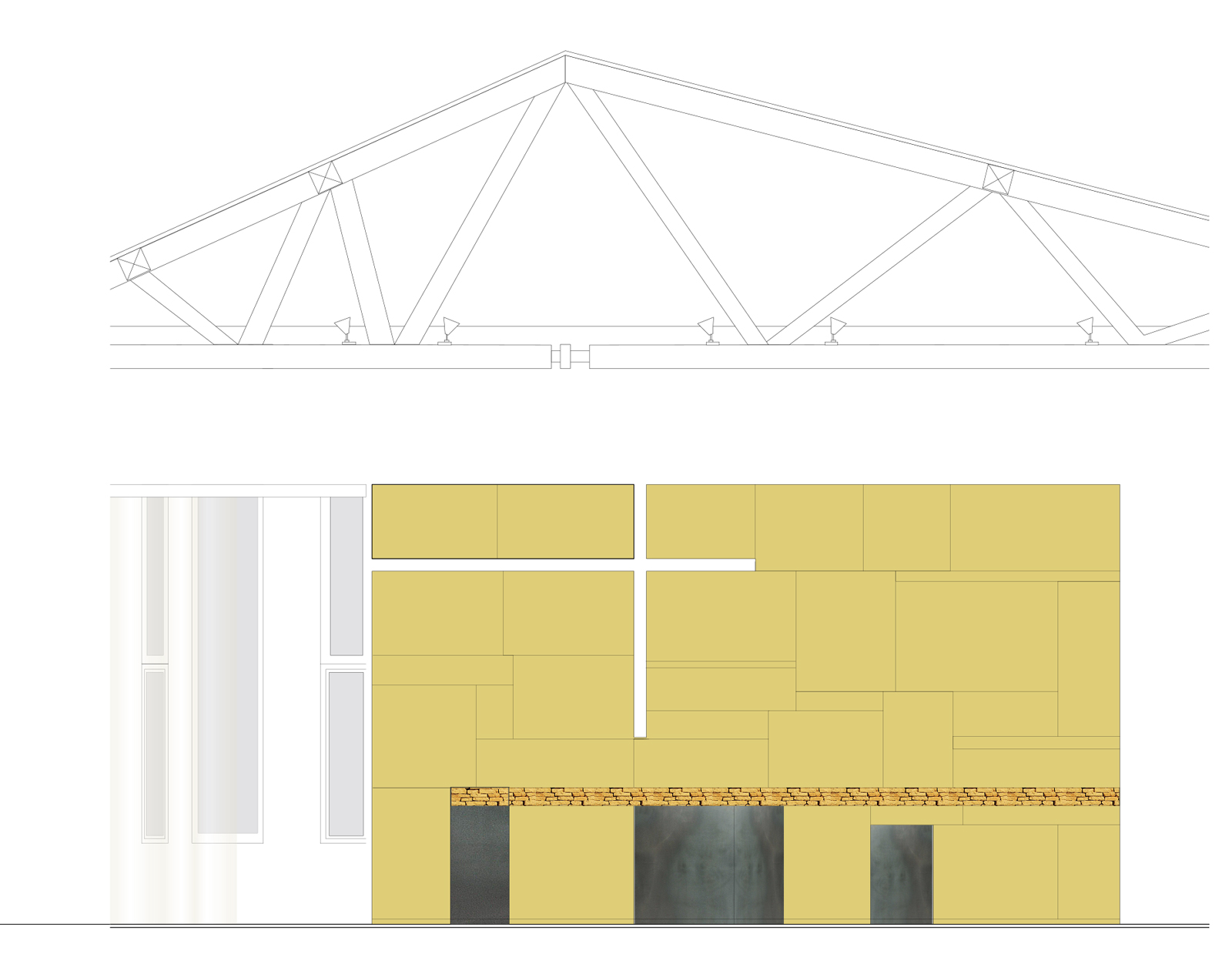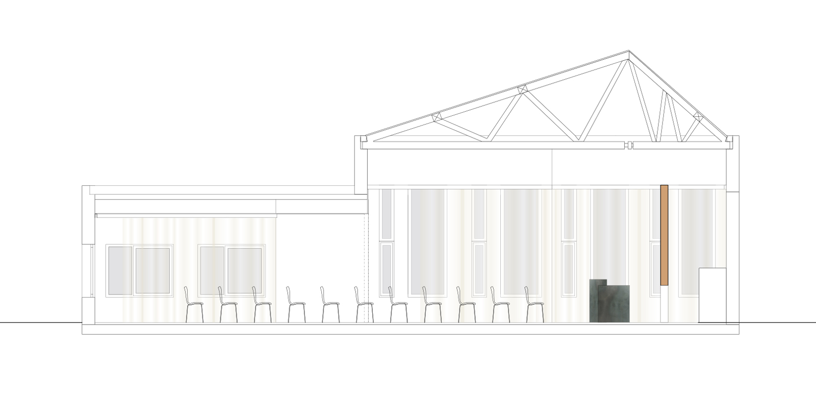 Die Raumschale muss purifiziert werden, um die Wirkung der Wand zu unterstützen- auch das Holztragwerk der Decke wird weiß gestrichen, wodurch sein schwerer Charakter gemindert wird zugunsten einer leichten, filigranen Struktur. Weiße Vorhänge unterschiedlicher Durchlässigkeit regeln die Transparenz, den Außenbezug und den Lichteinfall und schaffen eine freundlich- klare Atmosphäre im Raum. Eine filigrane, moderne Bestuhlung würde diese Wirkung noch unterstützen.